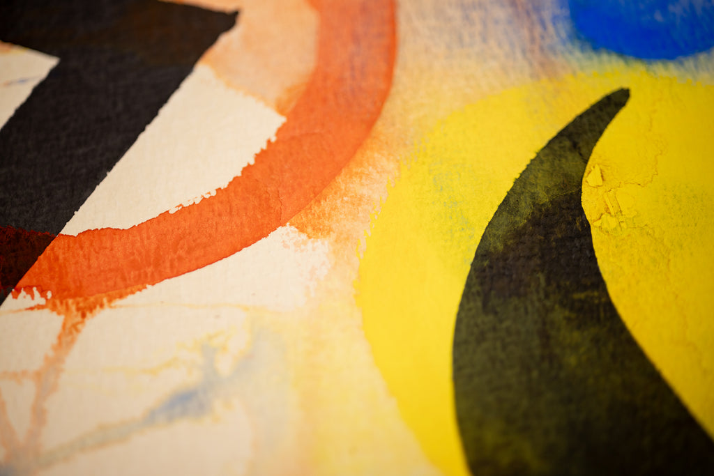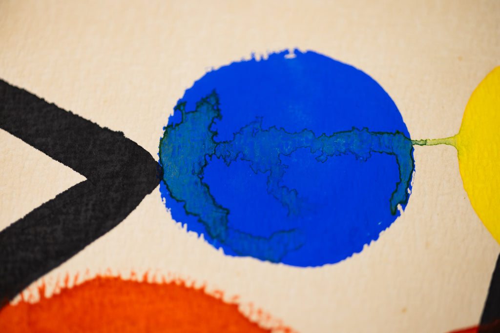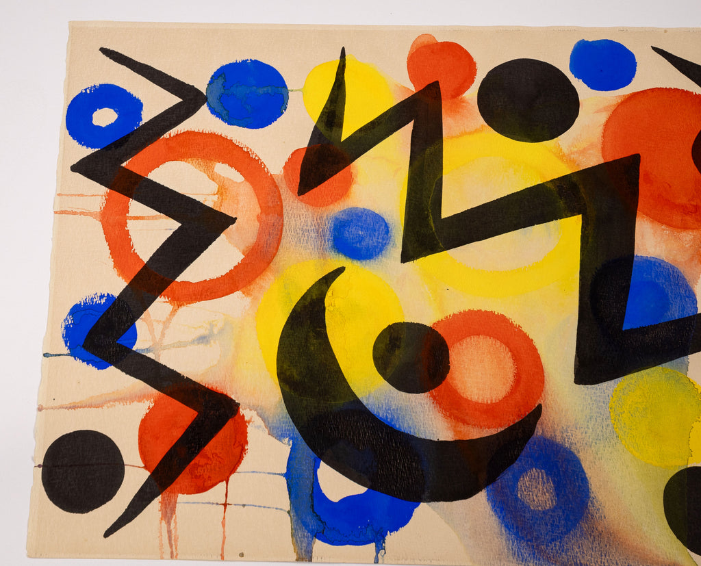 Calder's paintings of the 1960s were central to his creative practice. They provided a space where he freely explored the relationships of line, color, and balance that defined his artistic vision. In "Black Lightning", the composition reveals a vibrant sense of movement and harmony, demonstrating how his works on paper functioned as finished, autonomous expressions rather than supporting studies. Unlike his monumental projects, these paintings offer an immediate and intimate encounter with the artist's hand, capturing the energy and spontaneity that fueled his practice.