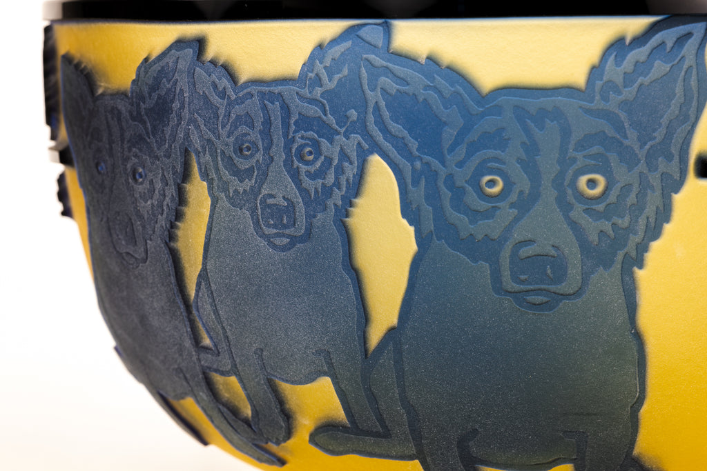 The Blue Dog, first introduced in the early 1990s, has become a hallmark of Rodrigue's artistic legacy, symbolizing identity, heritage, and emotion. In this sculpture, the motif is paired with cypress trees, merging symbolic imagery with the unique qualities of cameo glass. The interplay of transparency, layered color, and form gives the piece dynamic depth, showcasing Rodrigue's innovative approach to translating his signature motifs into sculptural works.