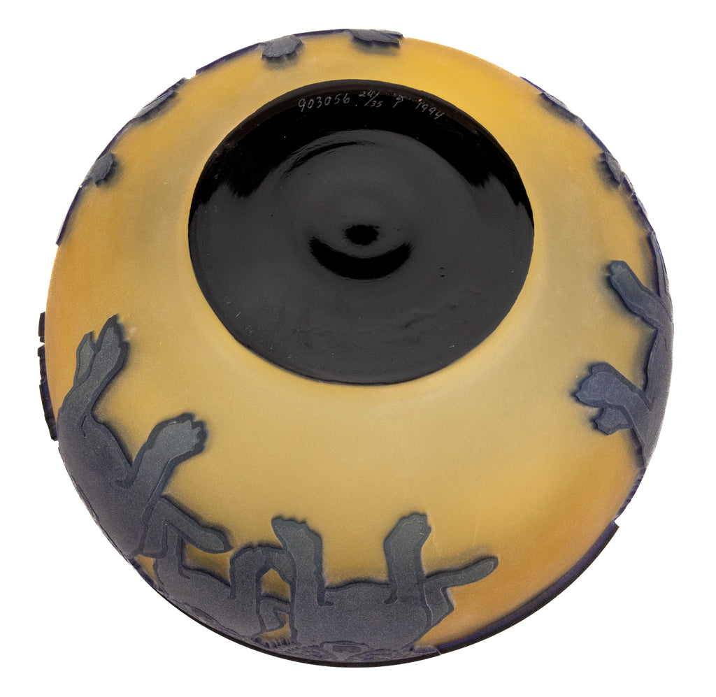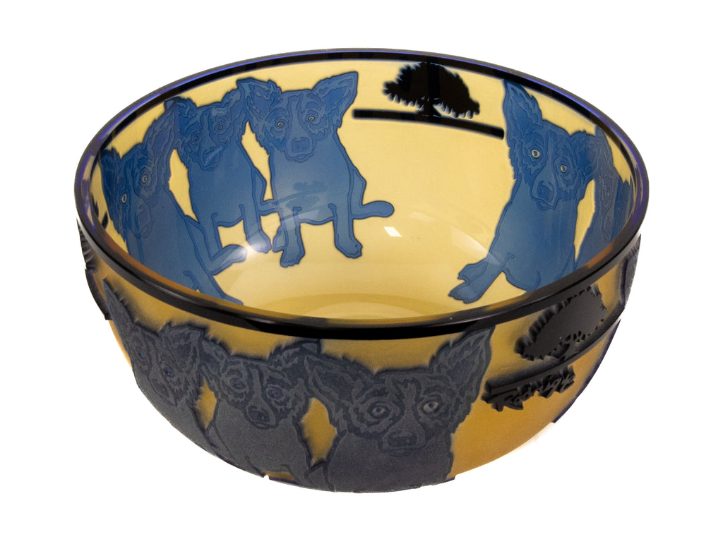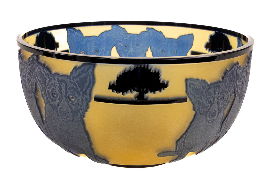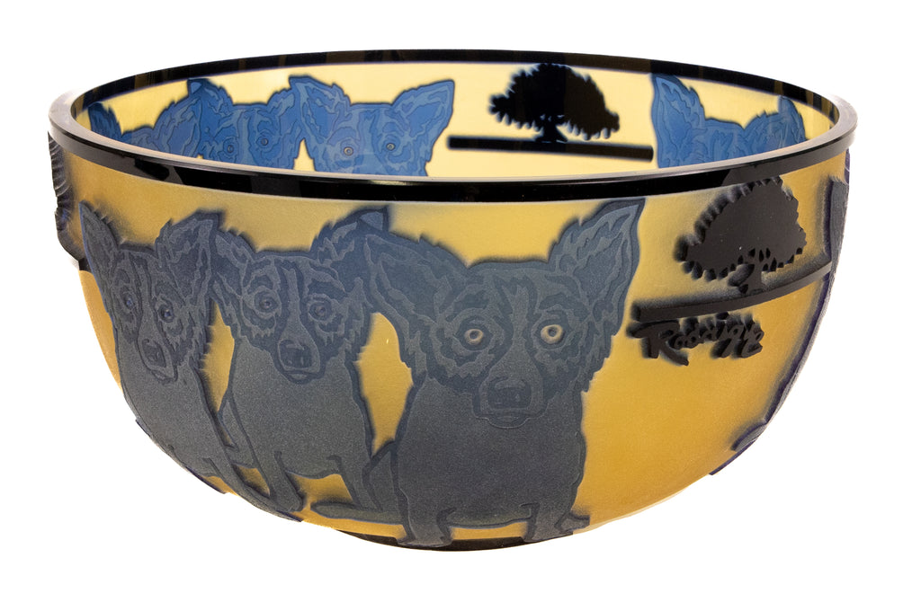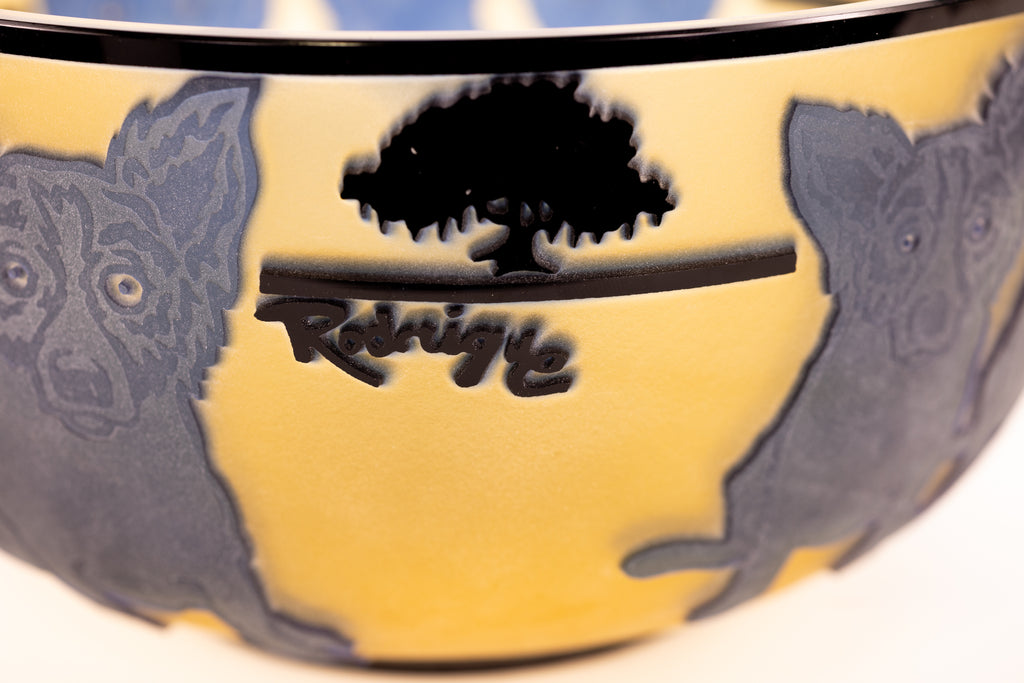 "Blue Dog with Cypress Trees" (1994) is a limited-edition cameo glass sculpture by American artist George Rodrigue, notable for its rarity and exceptional craftsmanship. This edition, number 24 of 35, is inscribed with the artist's cypher, edition, and date on the underside and includes a gallery Certificate of Authenticity, confirming provenance and authenticity. Measuring 5 × 9 inches in diameter, the sculpture presents Rodrigue's iconic Blue Dog motif in a three-dimensional medium, a rare and highly collectible expression of his celebrated imagery.