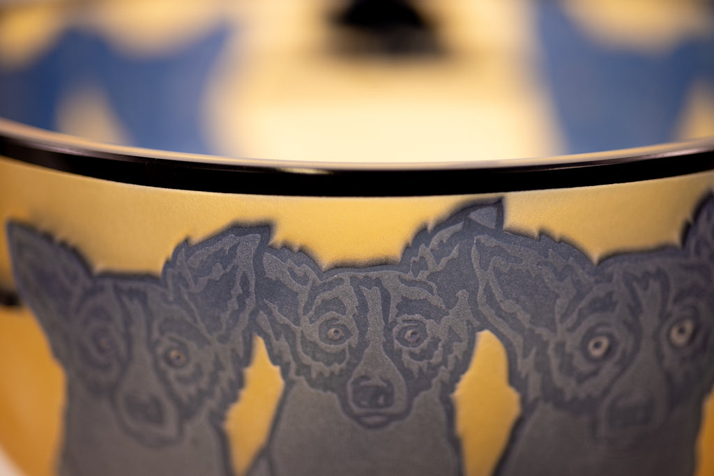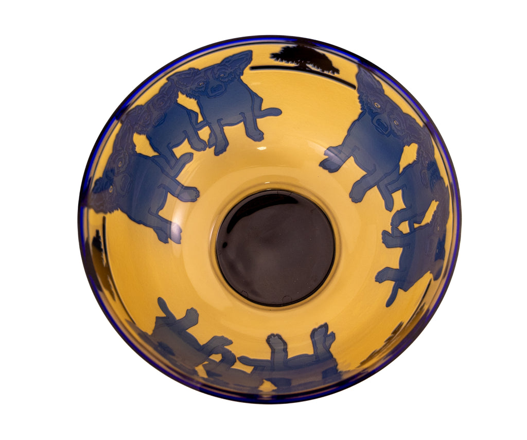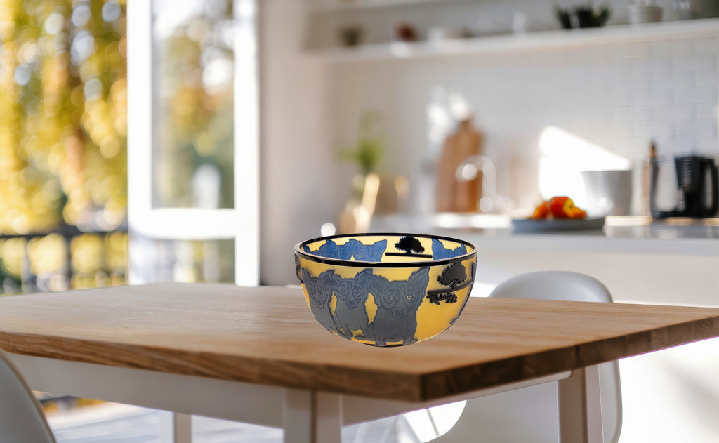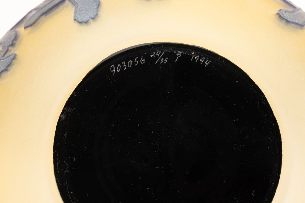 "Blue Dog with Cypress Trees" (1994) is a limited-edition cameo glass sculpture by American artist George Rodrigue, notable for its rarity and exceptional craftsmanship. This edition, number 24 of 35, is inscribed with the artist's cypher, edition, and date on the underside and includes a gallery Certificate of Authenticity, confirming provenance and authenticity. Measuring 5 × 9 inches in diameter, the sculpture presents Rodrigue's iconic Blue Dog motif in a three-dimensional medium, a rare and highly collectible expression of his celebrated imagery.
