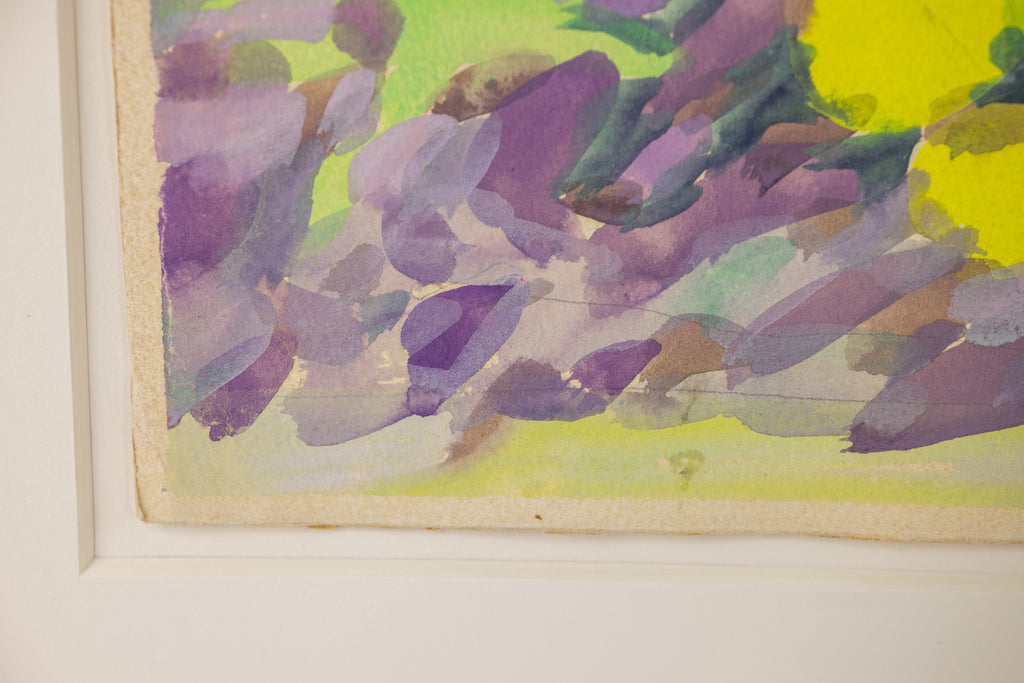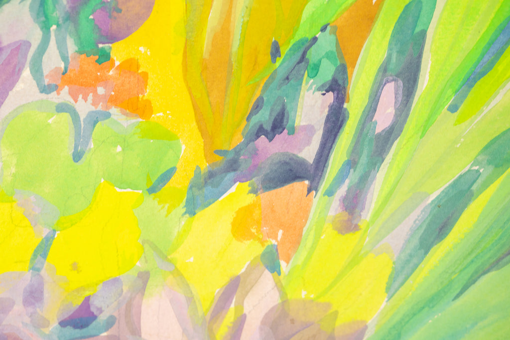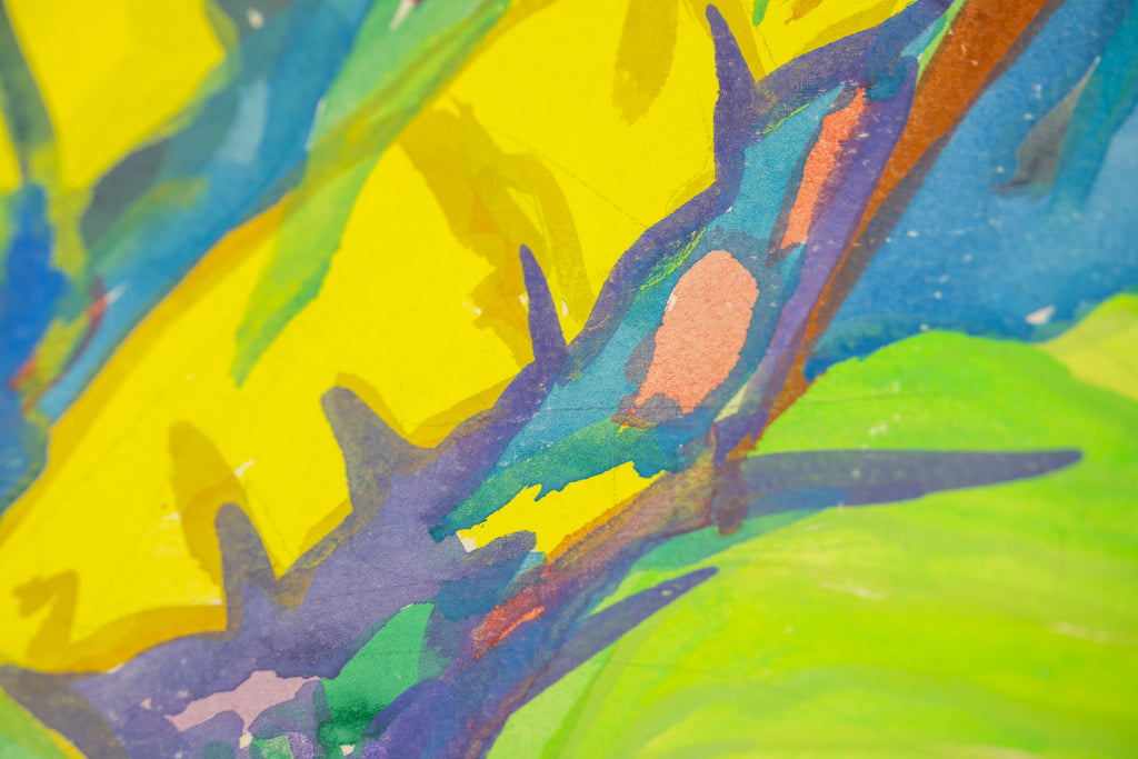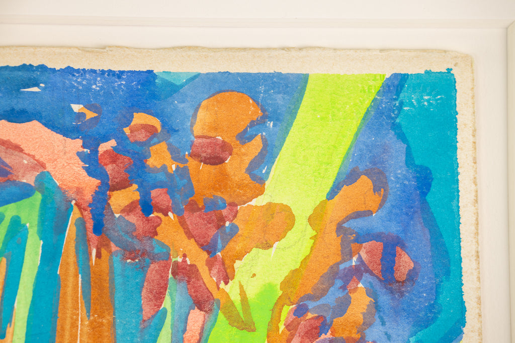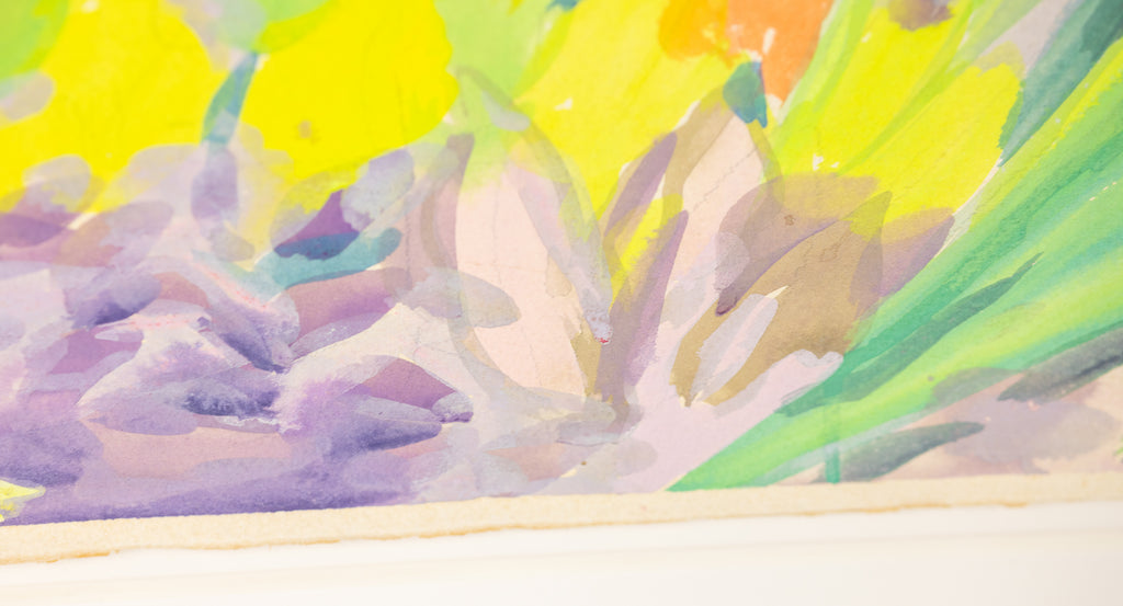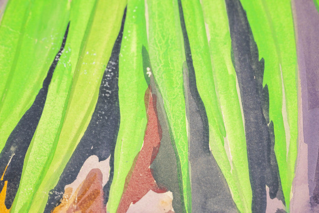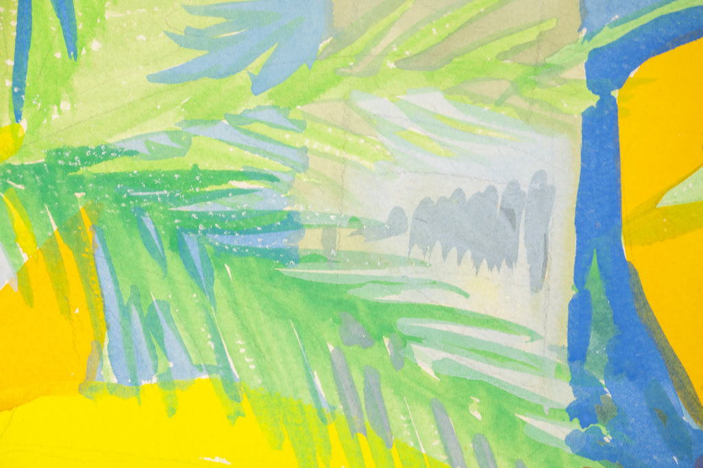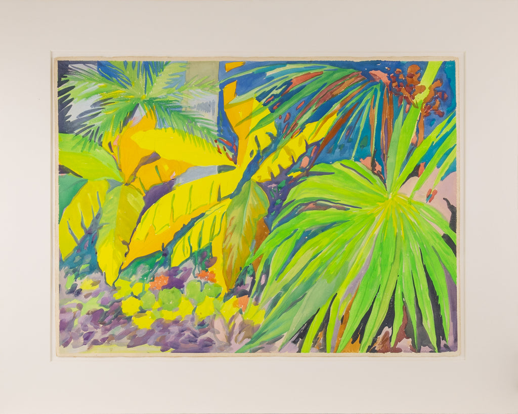 "Tropical Fronds" (1982) by Hunt Slonem is an expressive study of tropical foliage executed in gouache on Arches paper. The work is defined by multiple overlapping layers of vivid greens, yellows, and blues, which interact to create a sense of depth and rhythm across the surface. The textured application of paint emphasizes the luxuriance and movement of the leaves, capturing both the physicality and vitality of tropical plant life. The composition's abstraction is balanced by its reference to recognizable forms, reflecting Slonem's lifelong engagement with nature as a source of color, pattern, and structure.