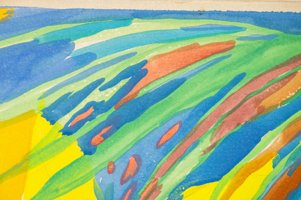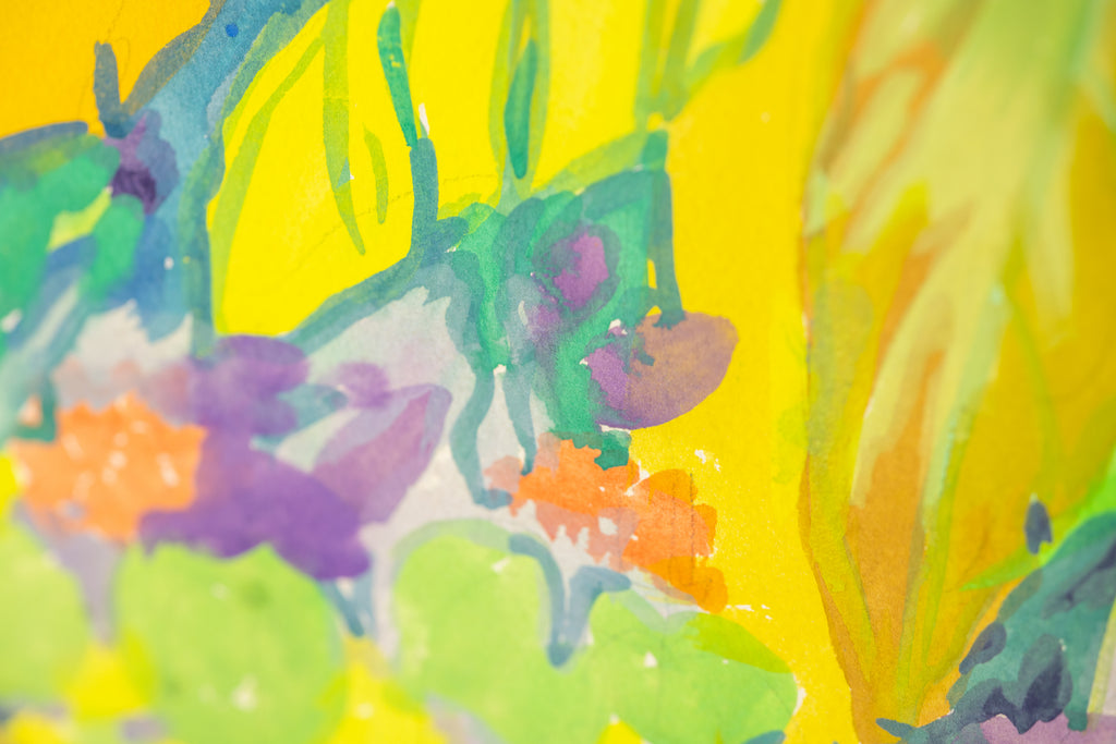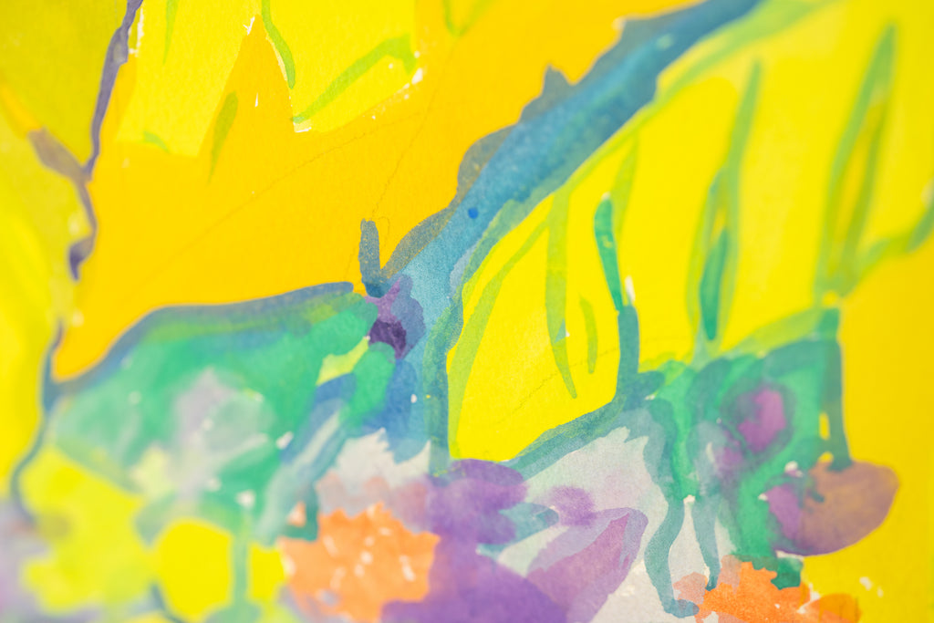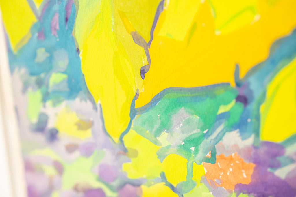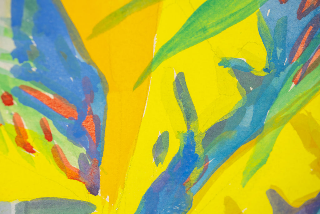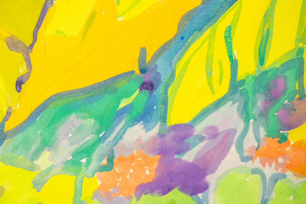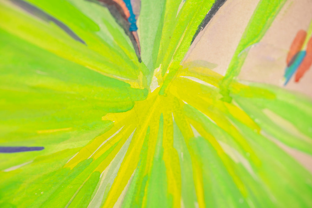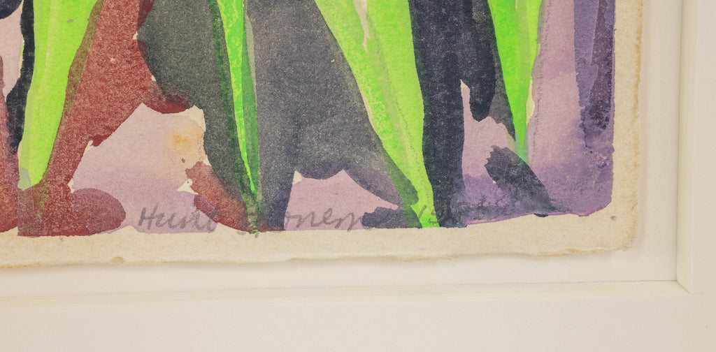 "Tropical Fronds" (1982) by Hunt Slonem is an expressive study of tropical foliage executed in gouache on Arches paper. The work is defined by multiple overlapping layers of vivid greens, yellows, and blues, which interact to create a sense of depth and rhythm across the surface. The textured application of paint emphasizes the luxuriance and movement of the leaves, capturing both the physicality and vitality of tropical plant life. The composition's abstraction is balanced by its reference to recognizable forms, reflecting Slonem's lifelong engagement with nature as a source of color, pattern, and structure.