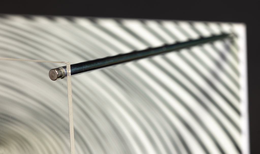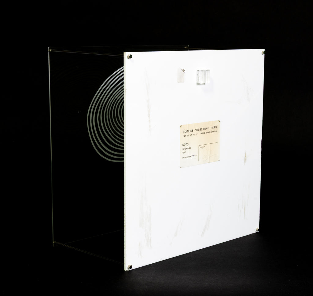 Spiral is a kinetic sculpture by Venezuelan artist Jesus Rafael Soto, created in 1967 as part of his Sotomagie series. This work is number 49 from an edition of 100, produced by Editions Denise Rene and printed by Atelier Arcay in Paris. It is constructed using screenprinted Plexiglas mounted within a shadow box frame, with chromed aluminum metal bars affixed to the front, creating a dynamic interplay between static and moving elements. The piece is signed by the artist on the verso and bears the gallery's original sticker. A gallery certificate of authenticity accompanies the artwork.