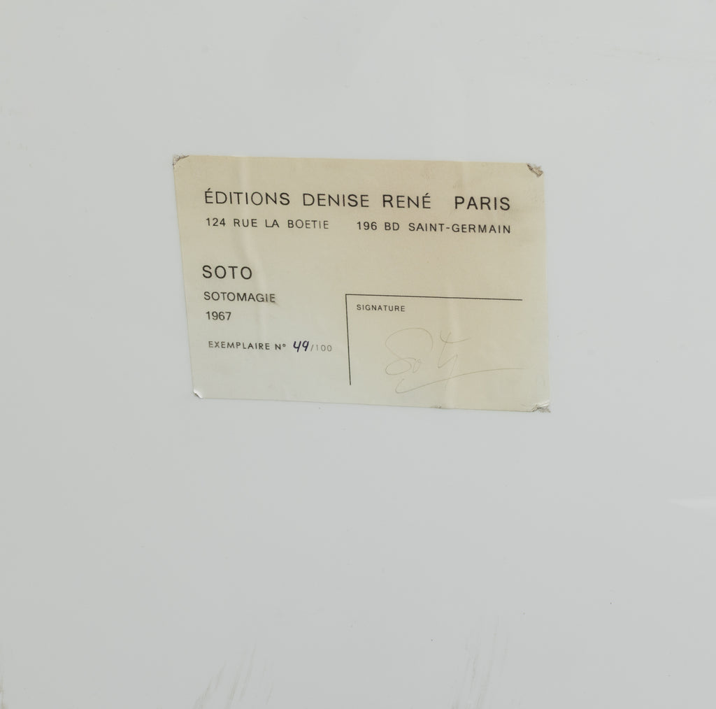 As a pioneer of kinetic and Op Art, Soto's Spiral exemplifies his exploration of perception and movement. The work's optical effects engage the viewer, creating a sense of motion and depth through its layered materials and design. This piece is part of the Sotomagie series, a portfolio of eleven screenprints that investigate the interaction between static images and kinetic perception. The series is represented in the permanent collection of The Museum of Modern Art (MoMA) in New York.