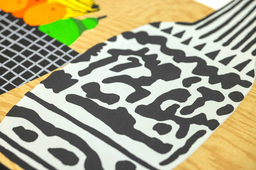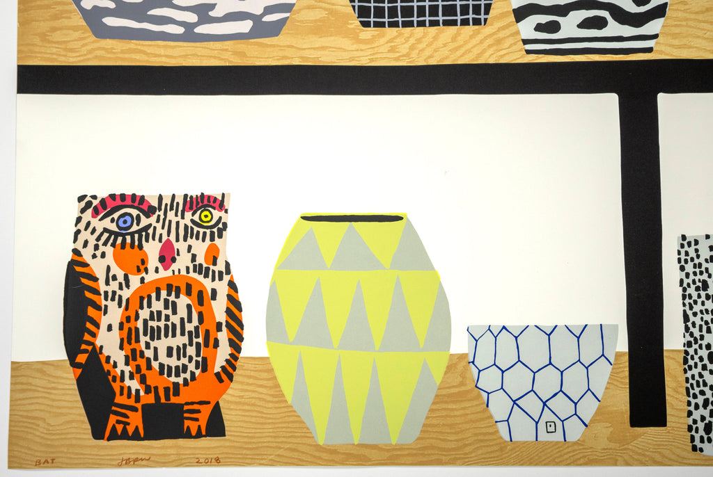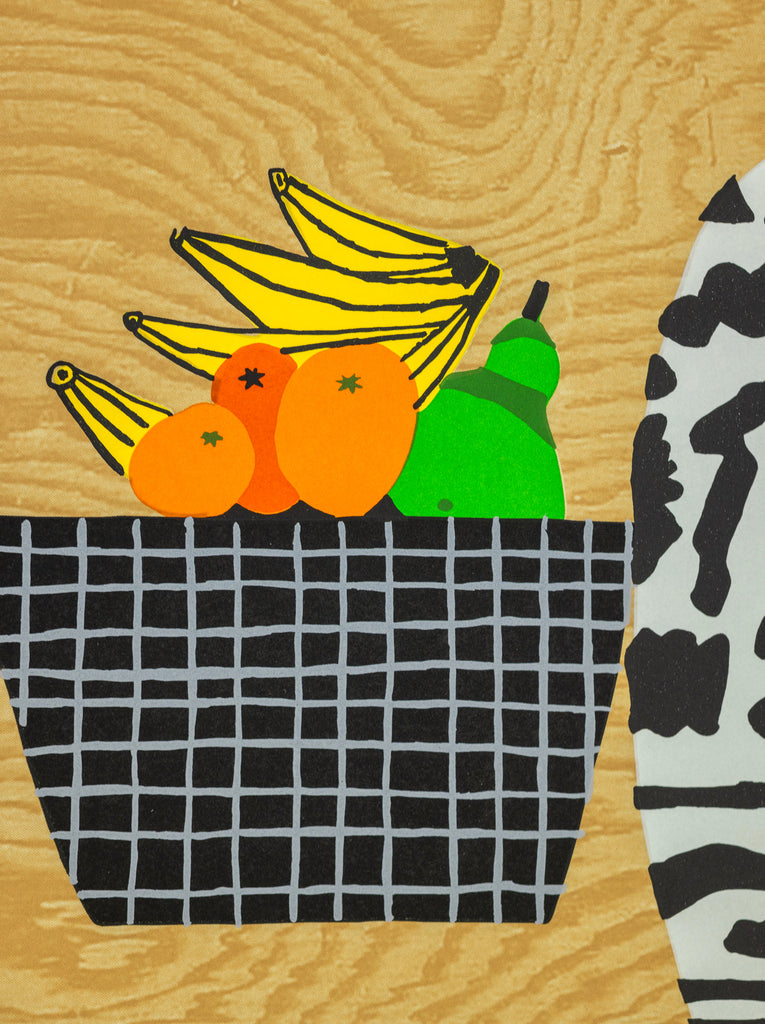 Jonas Wood's "Shelf Still Life" offers a balance of sharp edges and tonal variation. It also demonstrates Jonas Woods' sustained interest in translating everyday interiors into complex visual fields, a theme that recurs throughout his practice. "Shelf Still Life" stands out not only for its rarity as a BAT impression but also as an early and refined example of his approach to still-life subject matter, making it a highly desirable acquisition for collectors.