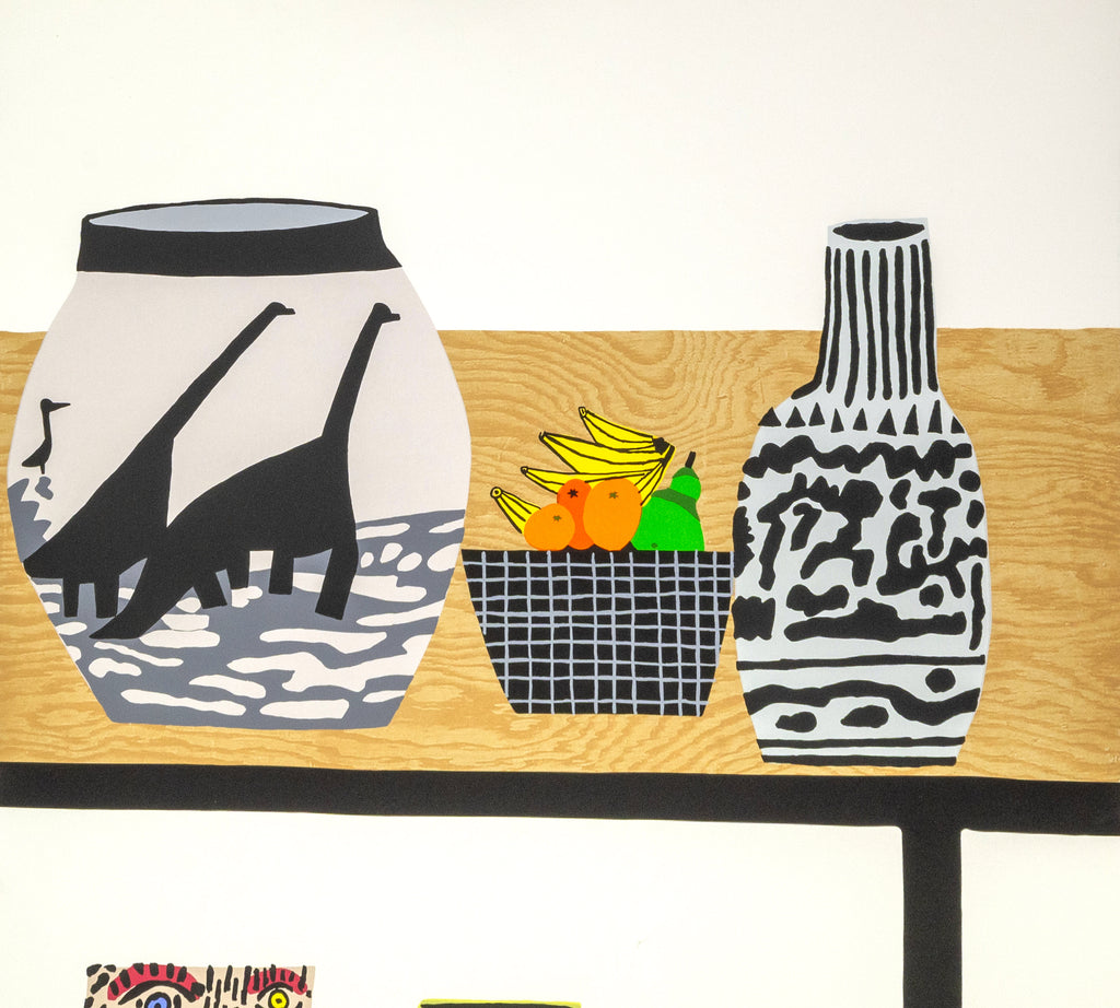 The composition presents an arrangement of household objects, including individually painted vases featuring playful motifs such as dinosaurs and an owl, as well as a bowl brimming with fruit. Heavy black contour lines divide the picture plane into distinct sections, flattening spatial depth and emphasizing surface and pattern. By layering bold blocks of color and intricate decorative motifs, Wood transforms an ordinary domestic scene into a dynamic study of form and design. His still life's merge the graphic clarity of Pop Art with personal memory, creating images that are both recognizable and stylized.