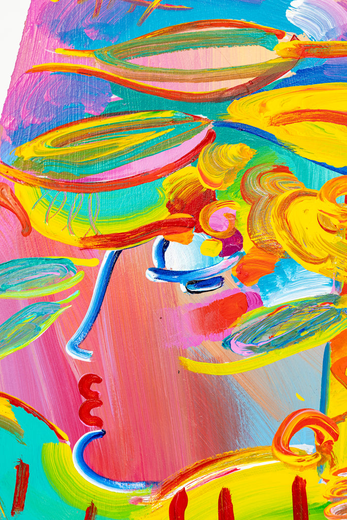 Peter Max's "Blushing Beauty - Ver II, Number 31" captures the artist's enduring fascination with radiant color and expressive form. Painted in 1995, this original acrylic on paper exemplifies Max's unmistakable style through its saturated palette of violets, aquas, yellows, greens, and fiery reds. The composition depicts a stylized profile of a blushing beauty, her features animated by sweeping, heavy brushstrokes that pulse with rhythm and vitality. Both playful and iconic, the subject resonates with Max's ability to merge figuration with abstraction in a way that feels at once personal and universal.