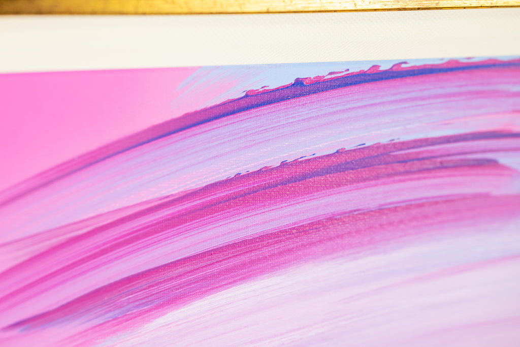 Peter Max's original painting on canvas, "Walking in Reeds (Version I, #77)" presents a vivid exploration of color and texture that reflects the artist's mature painterly style. Created in 2018, the composition features expressive, heavy brushstrokes and a radiant palette of purple, pink, golden yellow, and deep teal. These colors flow together to form an energetic surface that conveys a sense of movement and emotional resonance.