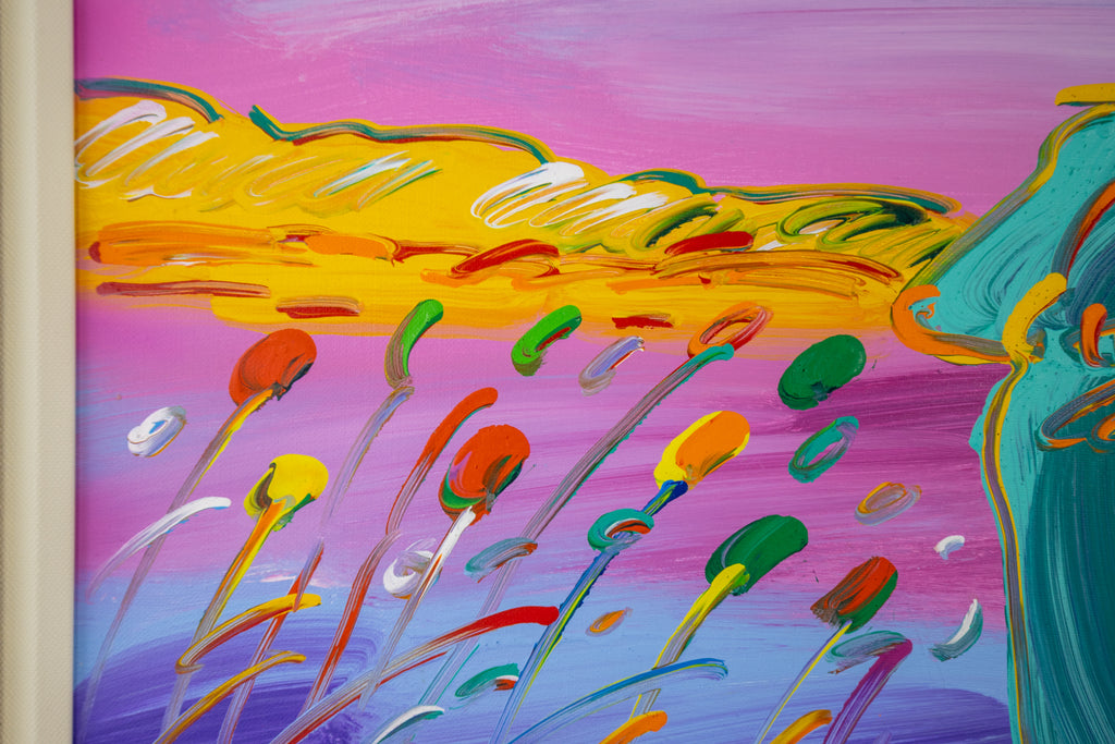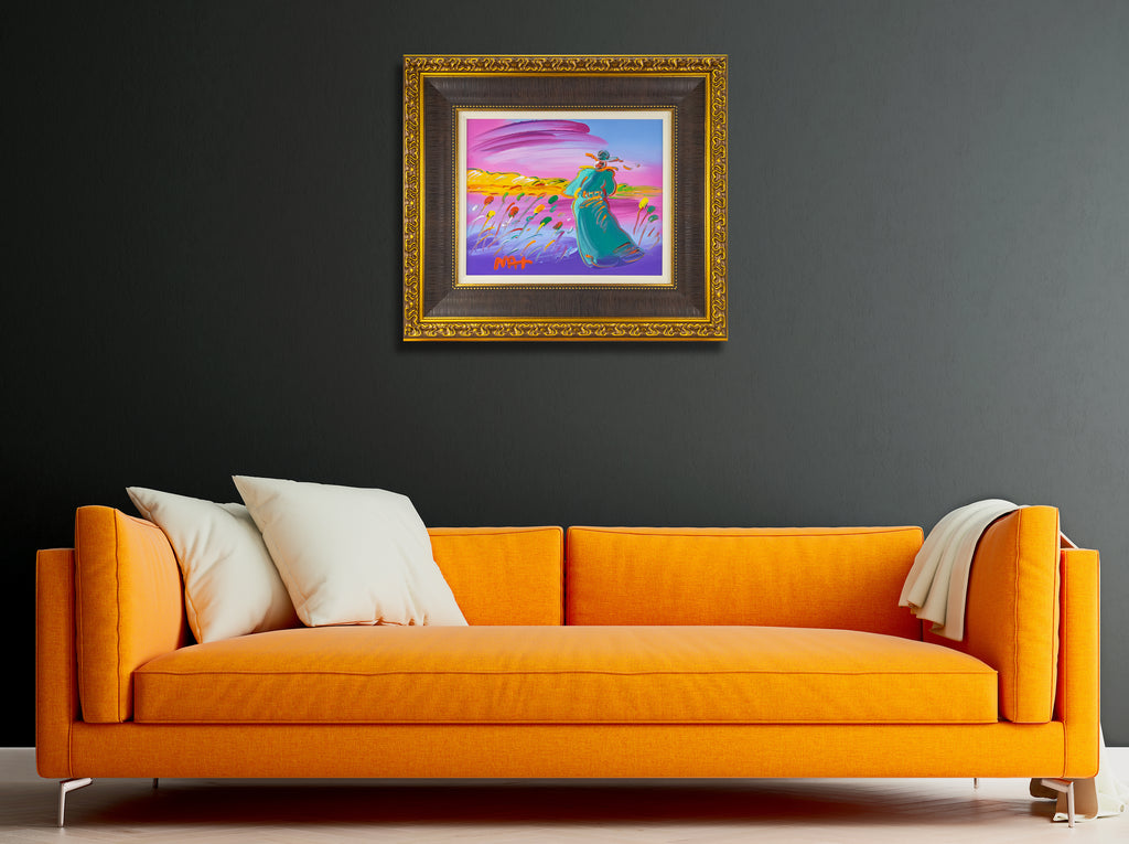 "Walking in Reeds (Version I, #77)" is signed "Max" and recorded under Peter Max Studios Registration #402360, confirming its authenticity and provenance. Measuring 16 x 20 inches on canvas and 28.5 x 32.25 x 3.75 inches framed, this original painting is accompanied by a Gallery Certificate of Authenticity from Modern Artifact.