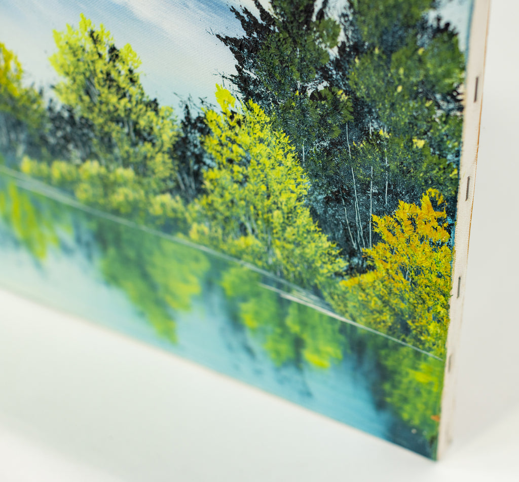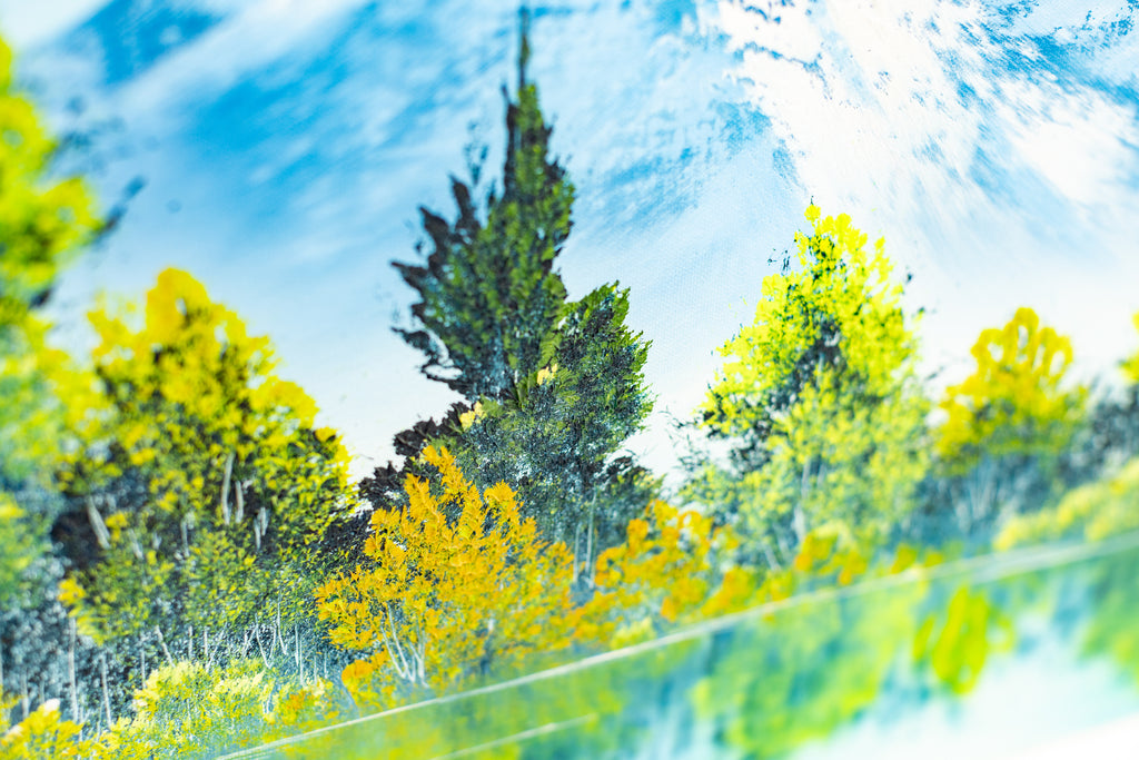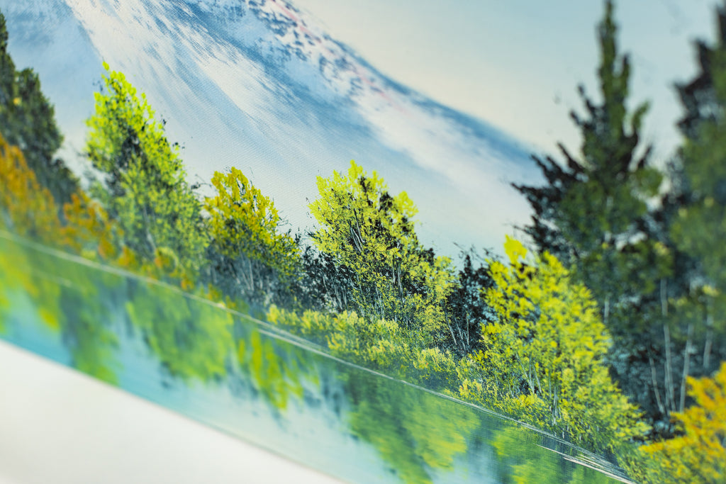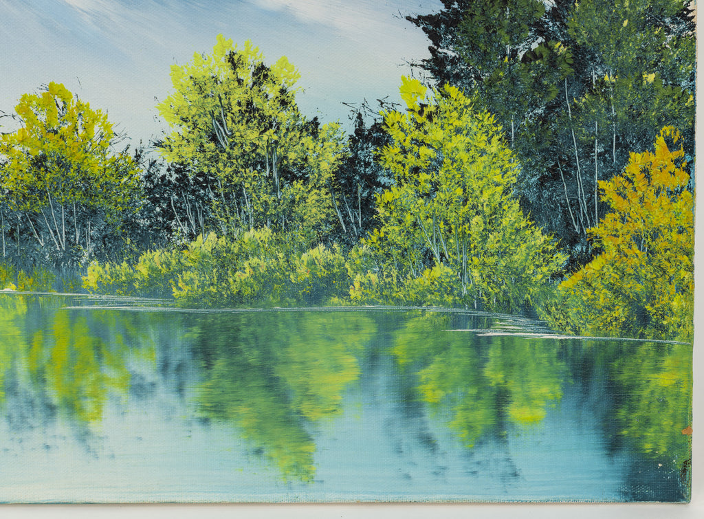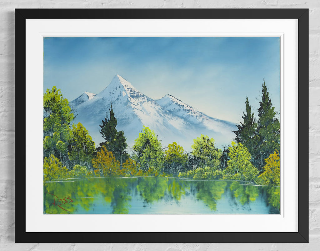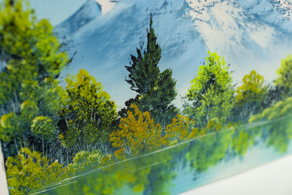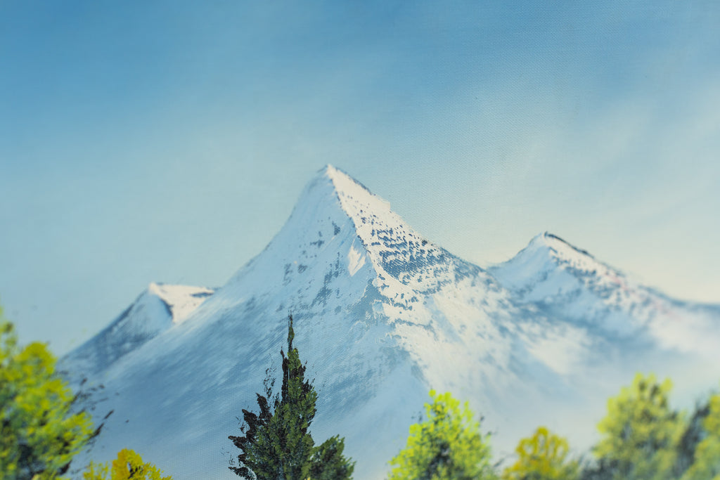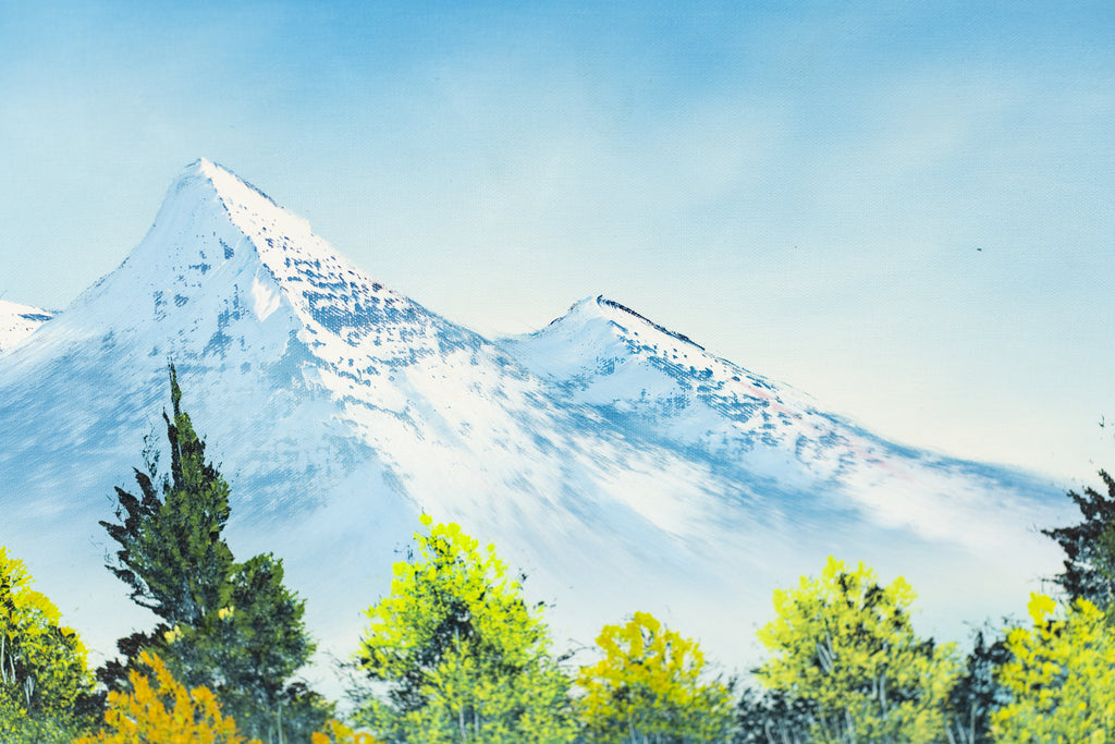 A tranquil mountain landscape unfolds across this original oil painting by Bob Ross, where snow-capped peaks rise above a still reflective lake framed by clusters of green and golden trees. The composition reveals Ross's signature ability to balance structure with spontaneity, creating harmony between the monumental and the serene. Executed with the wet-on-wet technique that defined his practice, the 18 x 24" original painting on canvas captures subtle variations in texture and tone, achieving a luminous, atmospheric effect that conveys both depth and calm.