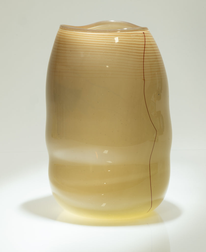 Dale Chihuly's 1980 "Blanket Soft Cylinder" is a handblown glass work from a pivotal period in the artist's career. This work emerges at a time when Chihuly was exploring the structural limits of the vessel form, allowing gravity, temperature, and material responsiveness to help shape the final object. The muted palette of soft cream and pale amber is consistent with his glasswork from this era, preceding the dramatic introduction of vivid chromatic experimentation that took place in his practice after 1990.