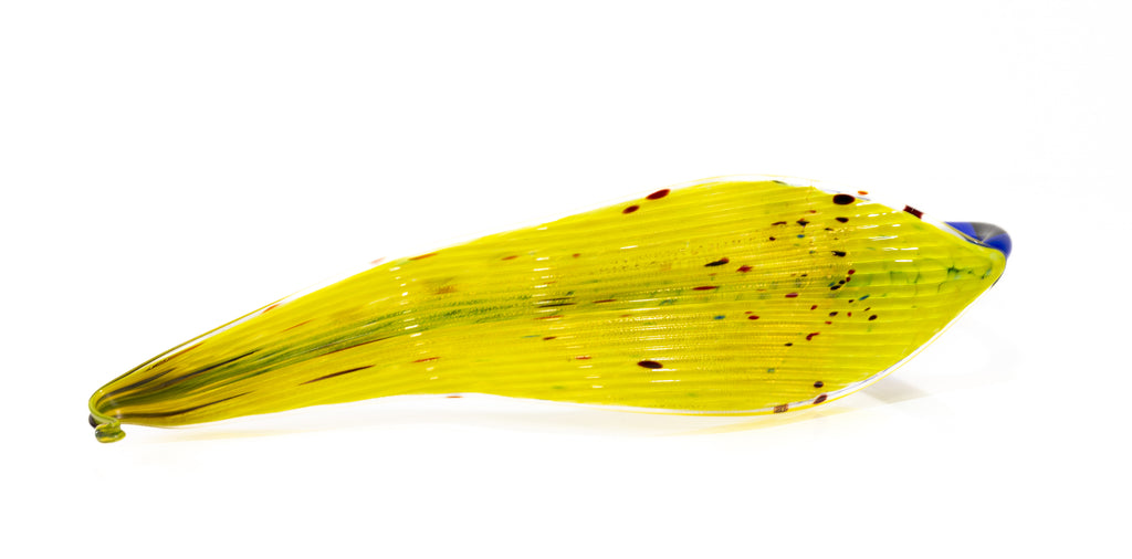 Emerging from the vase is a finely detailed yellow glass leaf, rendered with remarkable precision. The leaf's graceful curve and intricate veining demonstrate Chihuly's mastery in manipulating molten glass to achieve both delicate detail and dynamic movement. The composition draws upon the Japanese tradition of ikebana, in which line, balance, and spatial harmony guide the arrangement of natural forms.