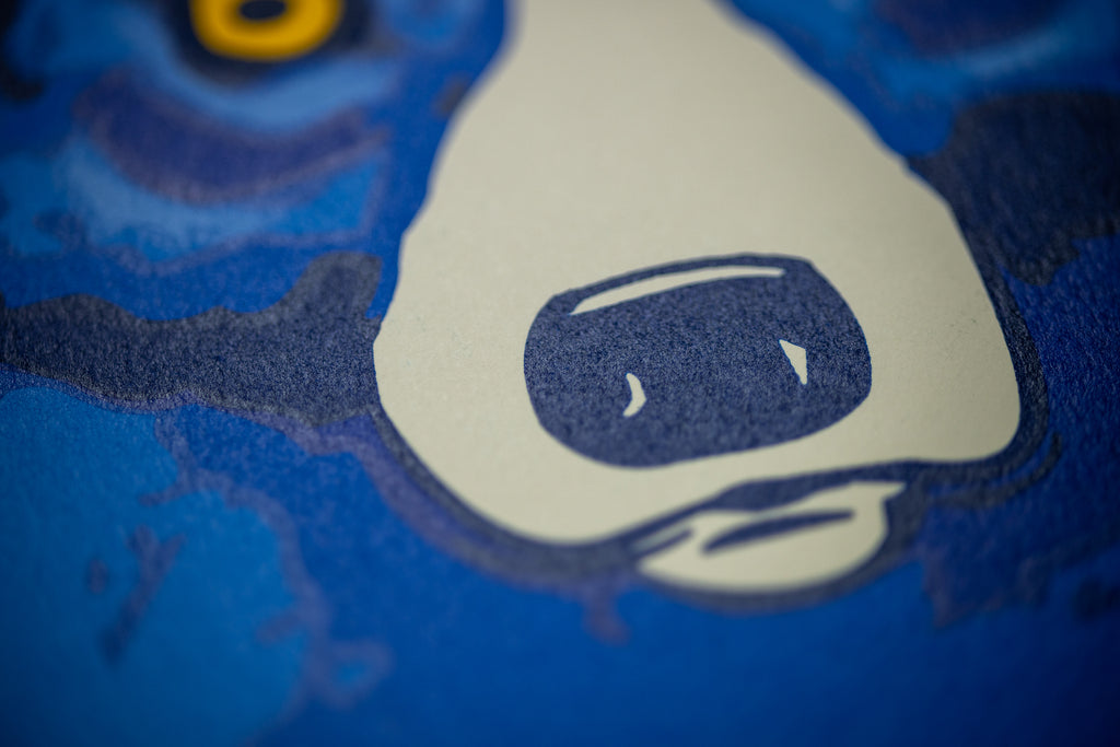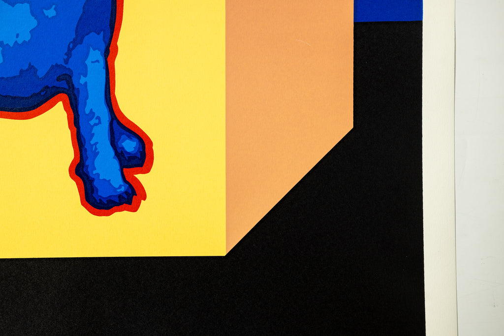 In this composition, Rodrigue places the enigmatic Blue Dog against a striking yellow background, creating a visually arresting contrast that emphasizes the figure's signature cobalt hue. The dog's expressive eyes and poised stance invite viewers into a space that is simultaneously playful, mysterious, and iconic. The work's crisp, vibrant color palette is heightened by the screenprint medium, which allows for precise layering and intensity, reinforcing Rodrigue's mastery of form and color.