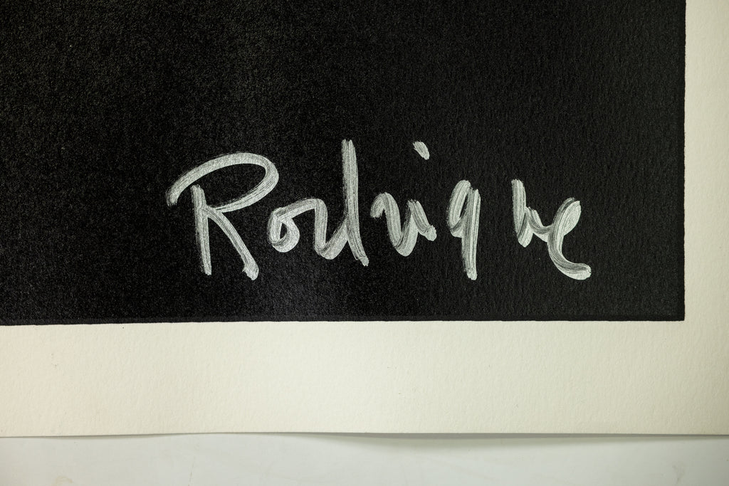 His career reached a turning point in the 1990s with the introduction of the Blue Dog, an image derived from Cajun legend. Rodrigue adapted the mythical loup-garou, a werewolf figure, into the form of a distinctive blue canine with yellow eyes. Initially created as an illustration for a book of Cajun ghost stories, the figure quickly took on a life of its own. Over time, the Blue Dog became a recurring subject, appearing in countless variations and contexts. For Rodrigue, the image functioned as both a personal symbol—often connected to memories of his late pet, Tiffany—and as a flexible vehicle for exploring themes of mortality, memory, and contemporary culture.
