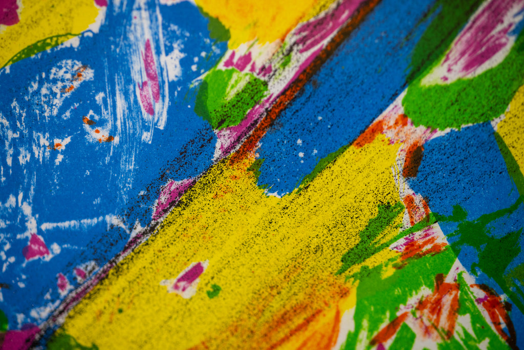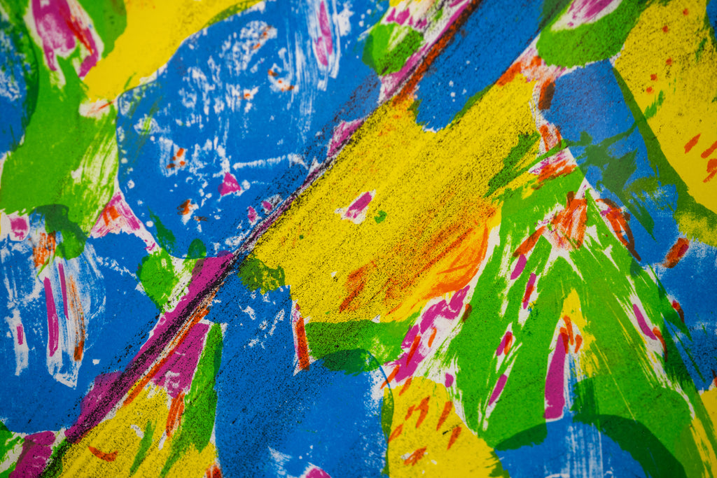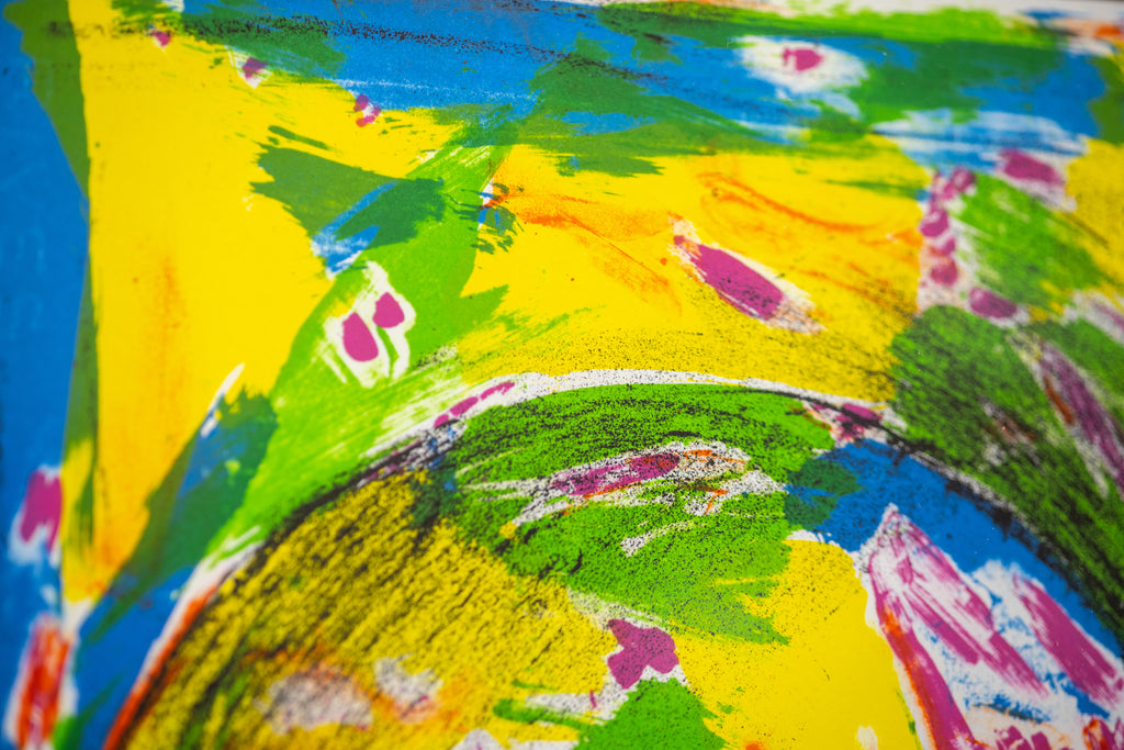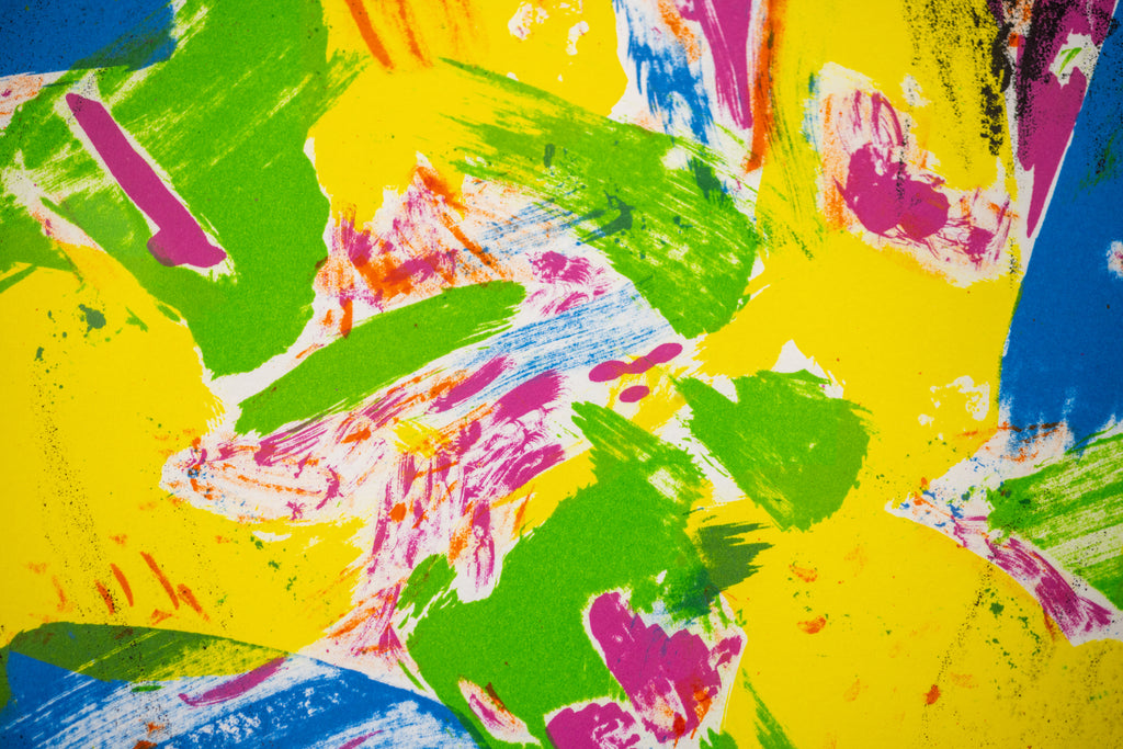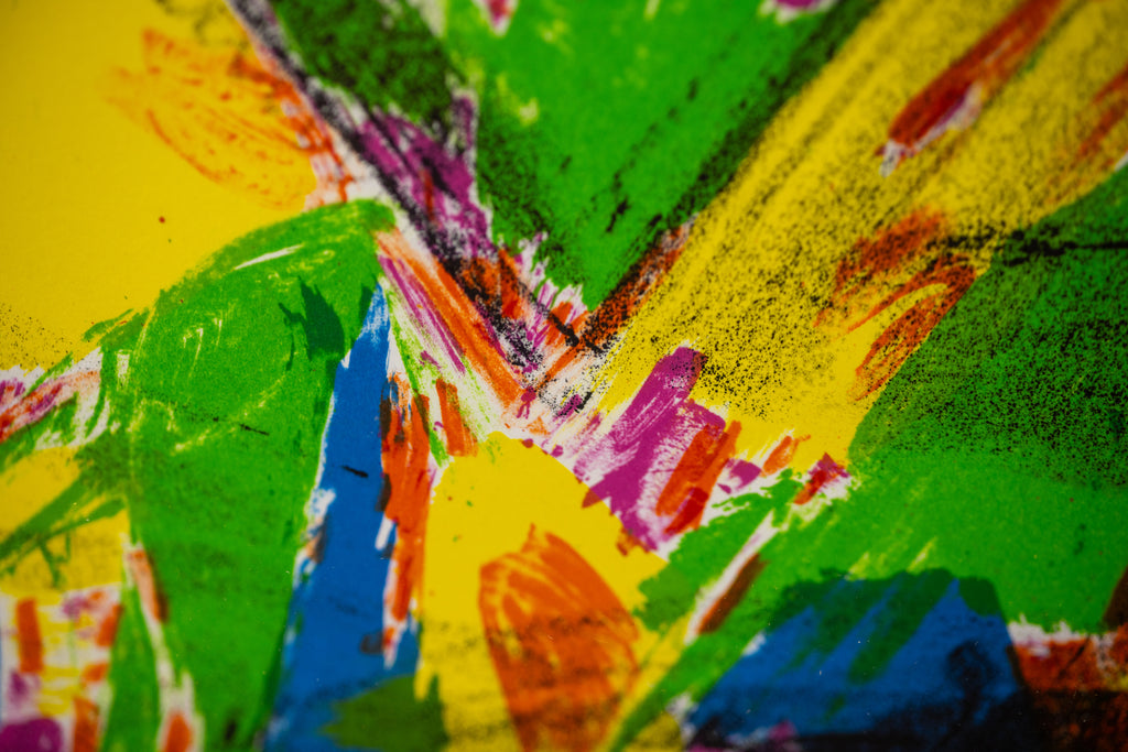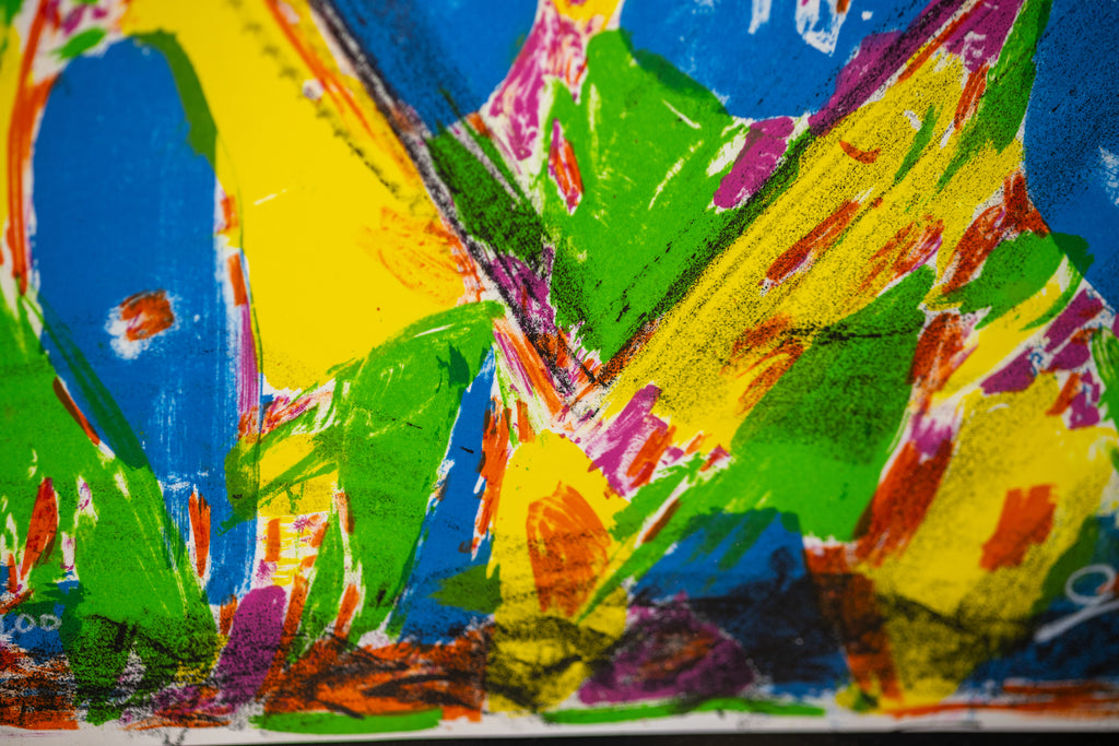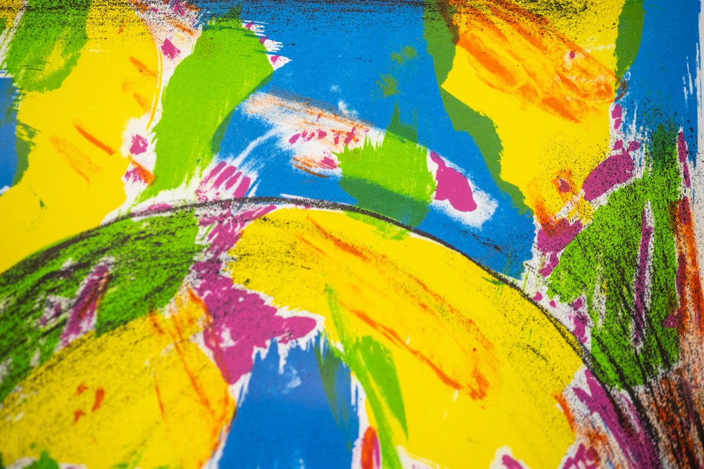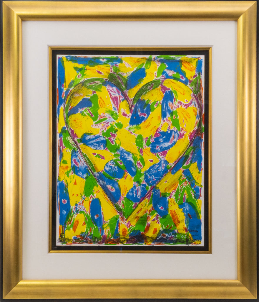 This lithograph, measuring 26.25" x 20.25", features a vivid interplay of saturated hues. Bright yellows, greens, and reds create an energetic ground against which deep blue forms pulse with vitality. The central heart, outlined with expressive strokes, emerges from this vibrant surface with both immediacy and depth. Dine's layering of texture and color conveys movement, giving the work an almost painterly quality despite its print medium.