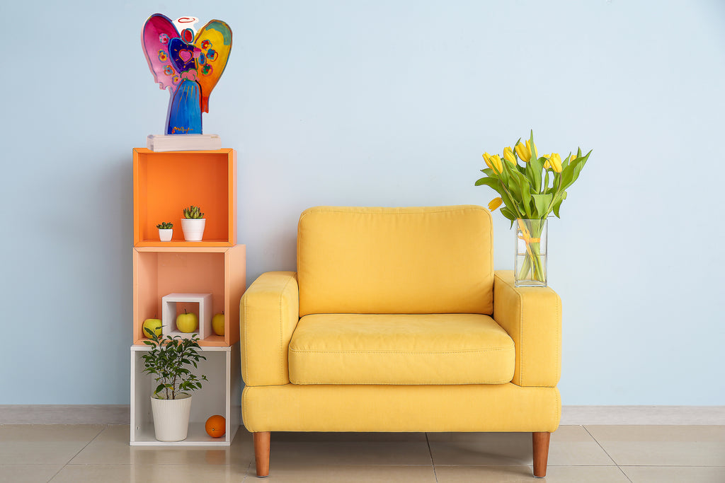 Peter Max's "Artist: Peter Max" acrylic sculpture presents a luminous angelic figure cradling a heart, reflecting one of the artist's most enduring themes. Across his career, the angel has appeared in paintings, prints, and sculptures as a symbol of protection, hope, and universal connection. In this work, Max brings the figure into three-dimensional form, combining sculptural presence with his signature vibrant color palette.