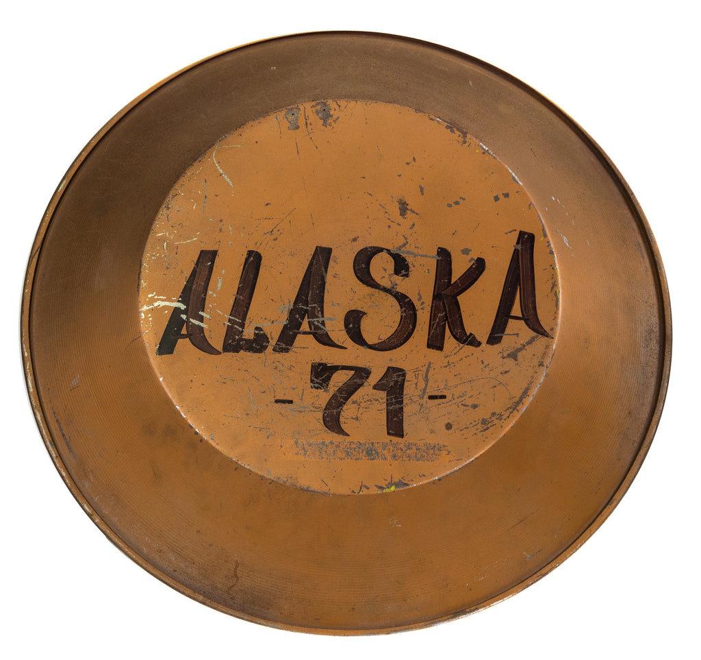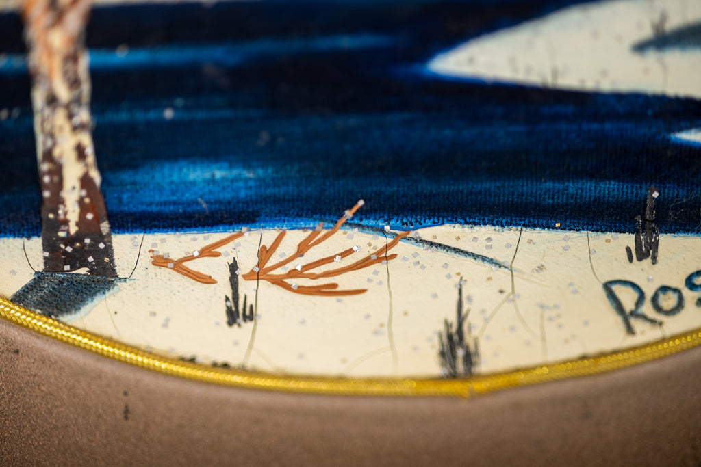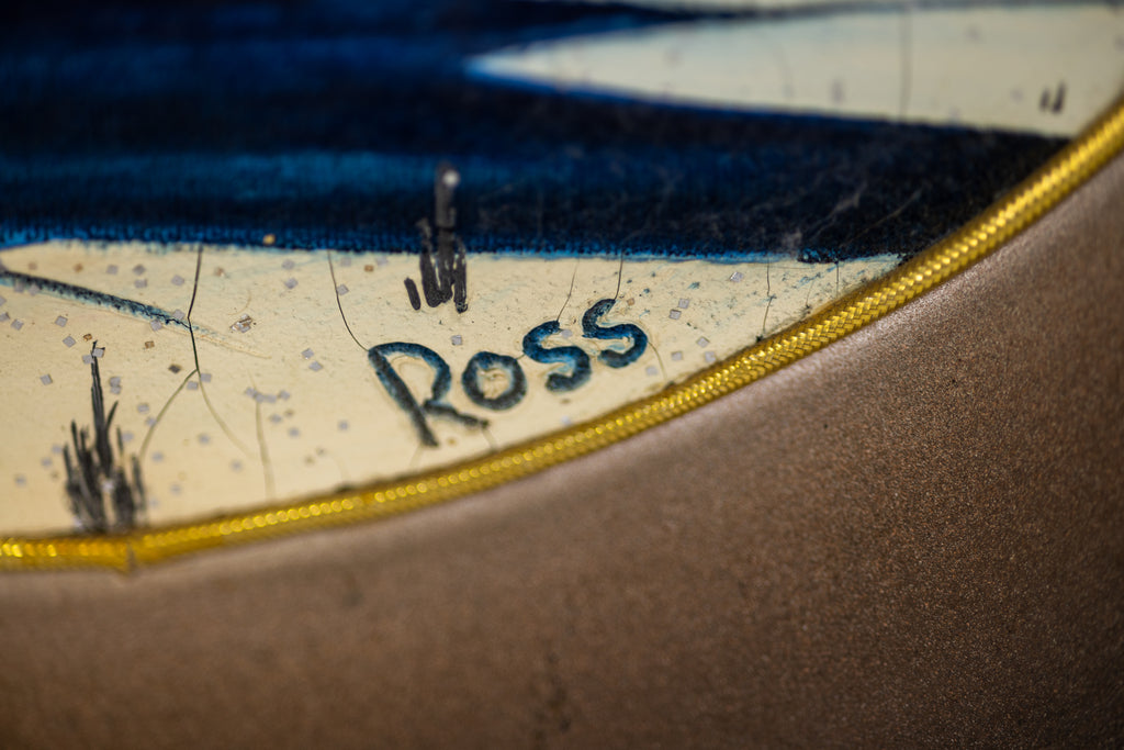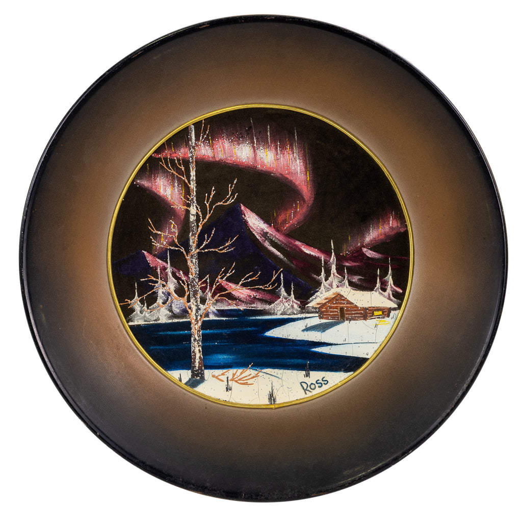 The circular gold pan framing the composition adds a distinctive sculptural quality, simultaneously grounding the work in Ross's Alaskan roots and alluding to the region's gold-mining heritage. This unusual presentation unites subject and form, creating a work that feels both intimate and iconic. Executed with precision and restraint, this painting reveals Ross's early technical mastery and foreshadows the compositional balance and atmospheric sensitivity that would later define his celebrated television landscapes.
