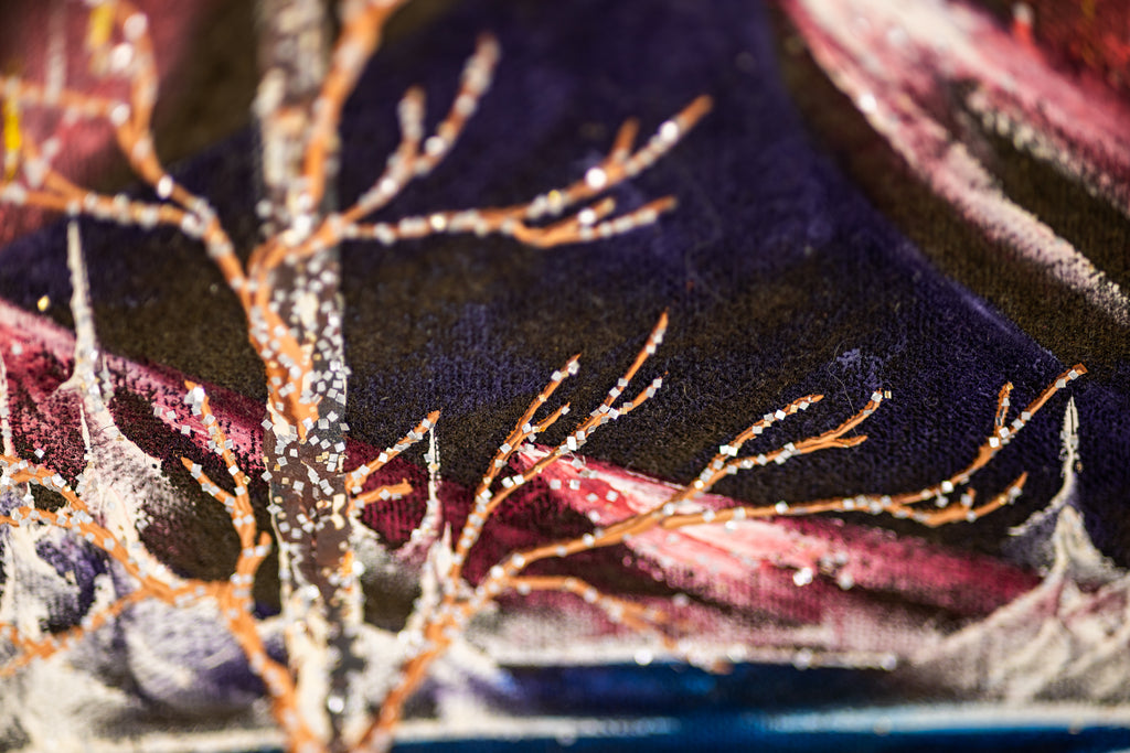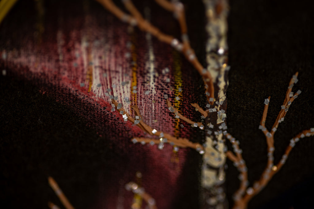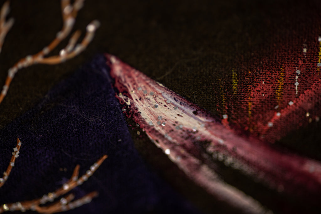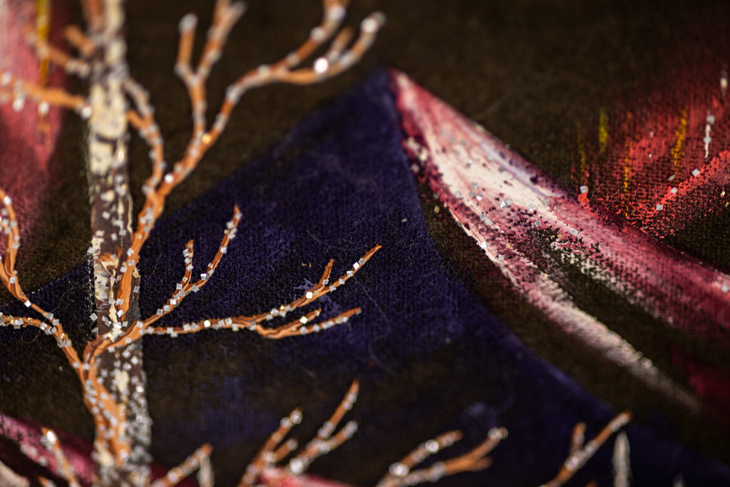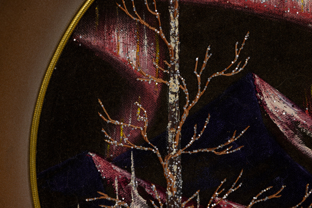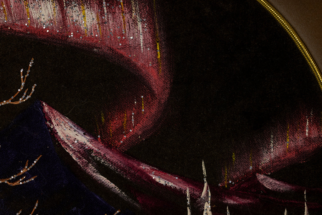Set beneath a vast, midnight sky illuminated by shimmering northern lights, the composition captures a tranquil winter night. In the foreground, a rustic cabin rests beside a still, reflective lake, its snowy banks leading the viewer's eye toward a towering mountain that rises in the distance. The aurora borealis arcs across the sky in luminous ribbons of pink and violet, their spectral glow heightened by the deep, velvety black surface beneath. The velvet medium, prized for its ability to intensify contrast and saturation, lends the work a radiant luminosity that echoes the otherworldly beauty of the Arctic night.