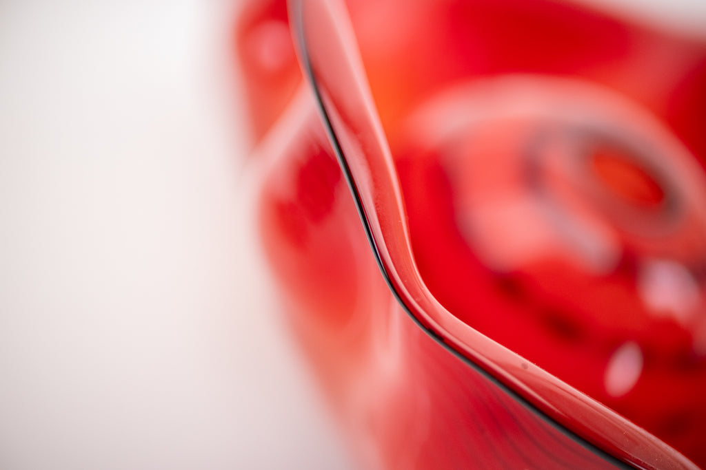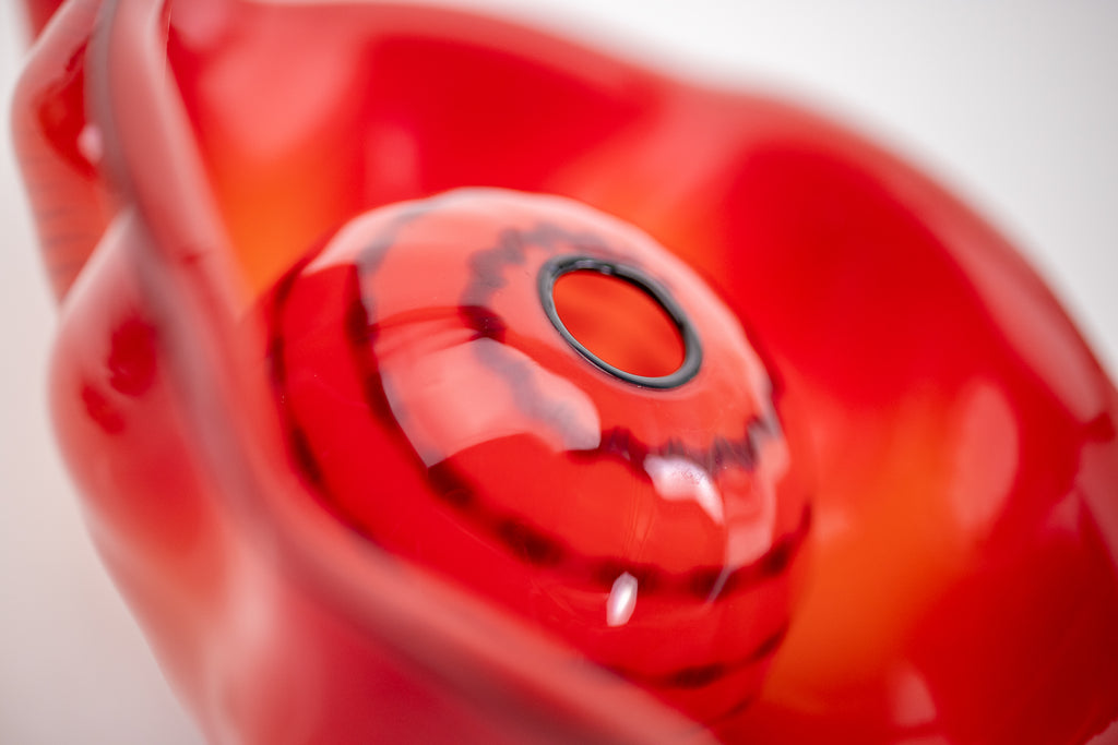 In its nested presentation, the "Chinese Red Seaform Pair" emphasizes Chihuly's interest in relational form, with the interior vessel echoing and amplifying the contours of the larger. This configuration recalls natural growth patterns found in shells and aquatic organisms while maintaining the abstraction that defines the Seaform series. The translucency of the glass allows light to move across the red surface and through its delicate structure, animating the vessels and shifting their tonal depth from fiery opacity to glowing luminosity depending on the angle of view.