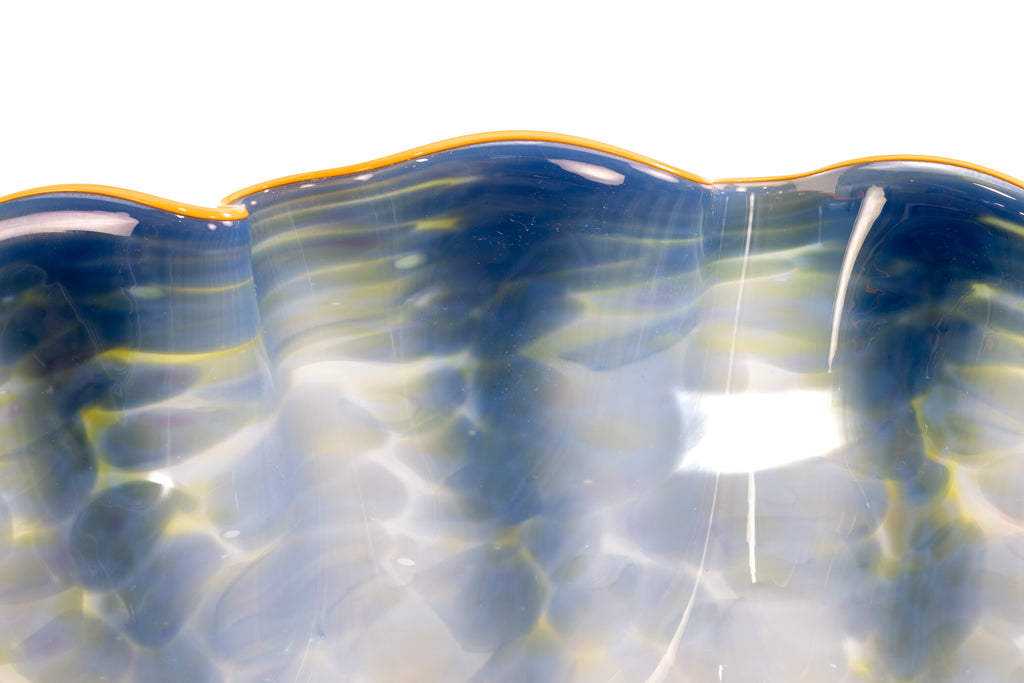 Created in 1984, Dale Chihuly's immersive "Harbor Blue Macchia with Tangerine Orange Lip Wrap" is a significant example of the Macchia series, which he began in the 1980s. The work measures 28 1/2 inches across, an unusually large size for this period in Chihuly's career. At that time, his studio operated with much smaller glassblowing teams than those that support his monumental works today. The technical challenges of producing glass on this scale with limited assistance underscore the rarity and importance of this piece within the artist's early body of work.