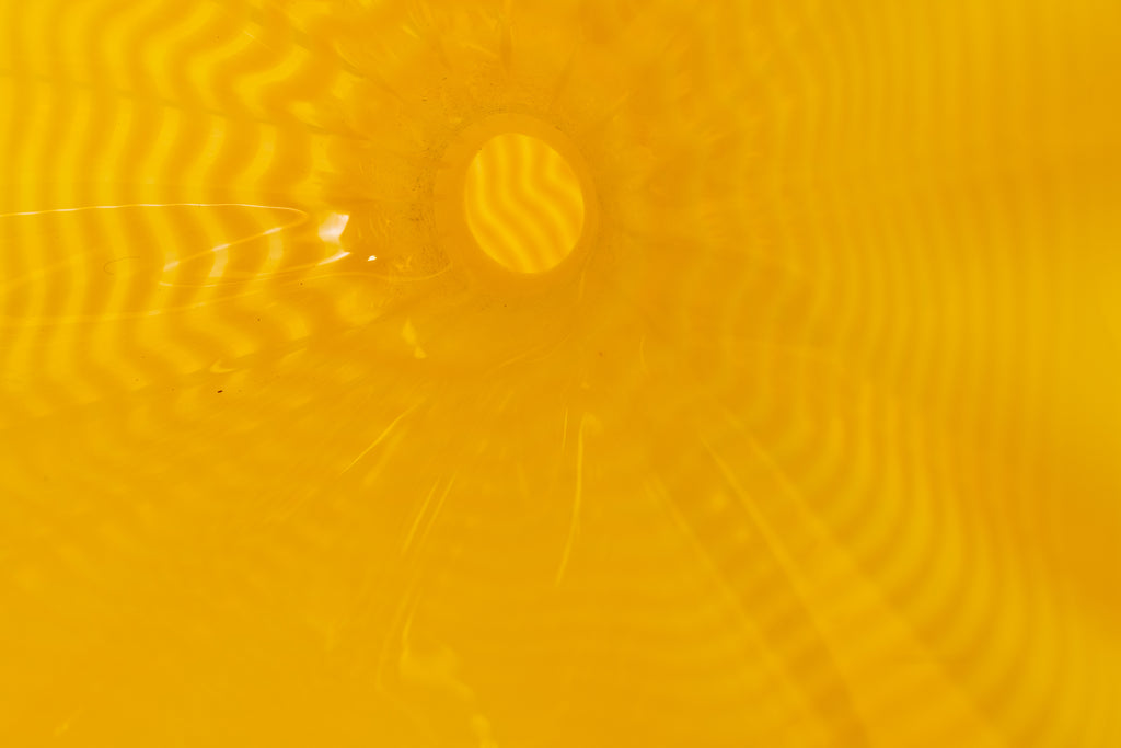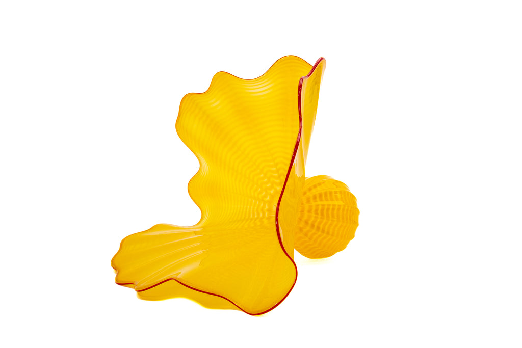 The Buttercup Yellow Persian is distinguished by its flower-like form, resting delicately on a ball foot. Its gently fluted edges and bold spiraling lines create a sense of motion and vitality, while the vivid buttercup yellow body contrasts dramatically with the deep blood-red lip wrap. This interplay of color and form exemplifies the experimental spirit of the Persian series, which Chihuly first introduced in 1986.