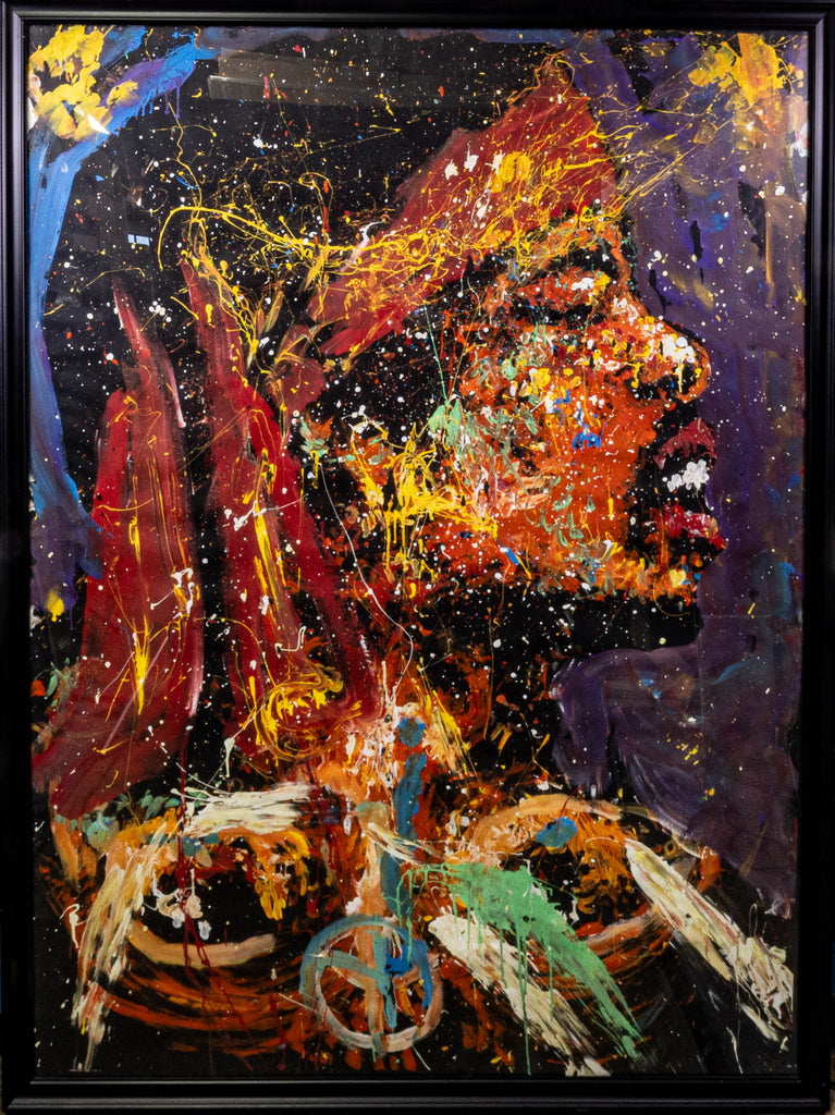 The sheer size of the work, combined with its expressive immediacy, amplifies its immersive impact, commanding presence both as a painting and as a testament to the performance from which it was born. Framed and accompanied by a Gallery Certificate of Authenticity, "Reverse Hendrix" stands as both a significant work of contemporary portraiture and an enduring tribute to two visionaries of their respective arts—Hendrix in music and Dent in paint.