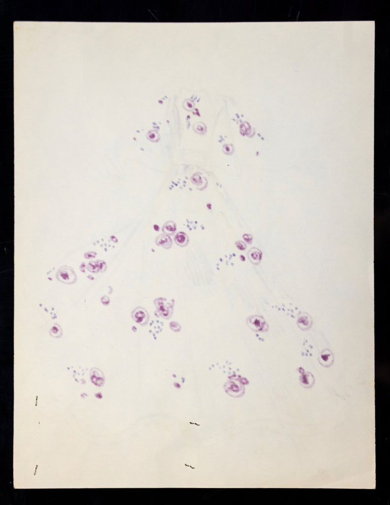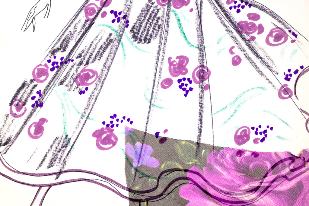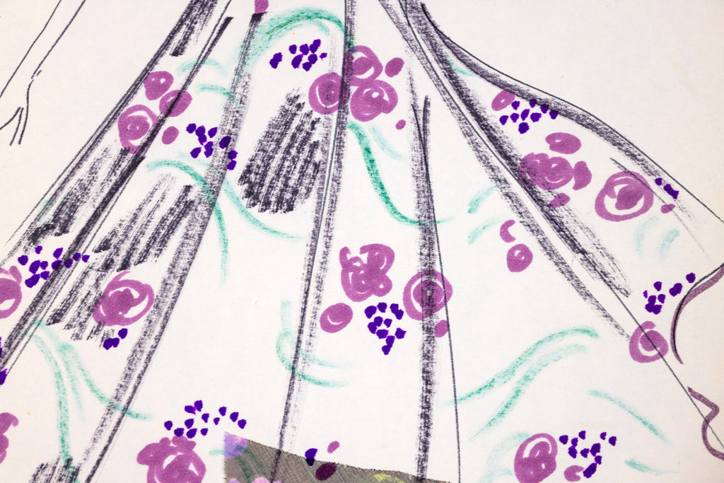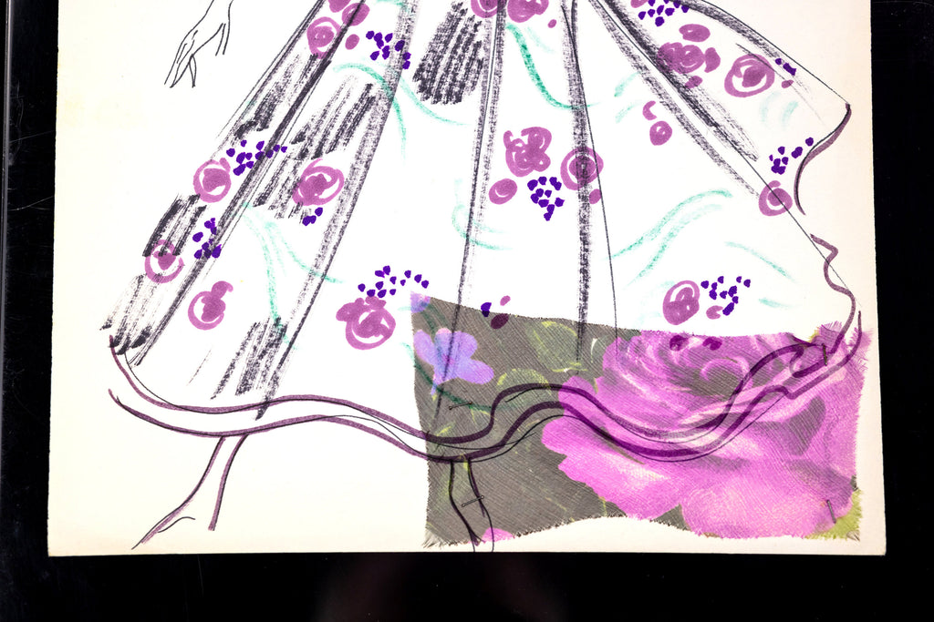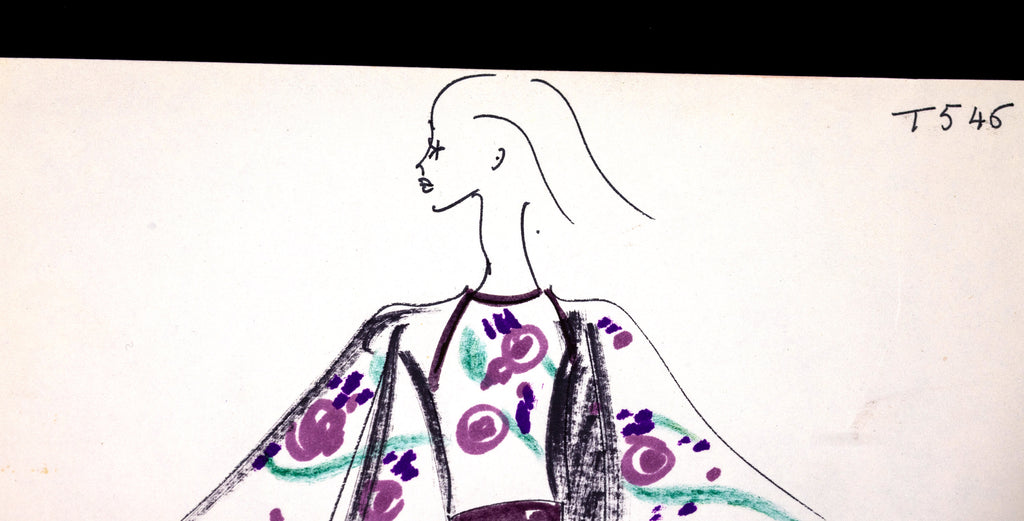 This rare and captivating original drawing by Karl Lagerfeld, created during his formative years at the House of Tiziani (circa 1963–1969), showcases the designer's exceptional talent as both an artist and visionary. The mixed media work features a finely detailed sketch of a woman clad in a tea-length white dress, elegantly designed with elbow-length bell sleeves and a vibrant floral motif in shades of purple and pink. A striking purple belt cinches the waist, accentuating the silhouette with precision and grace.