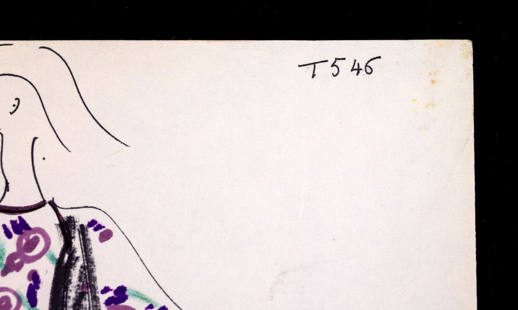 Lagerfeld's drawings from this era are exceptionally rare, offering a window into the early creative genius of a man who would later become one of fashion's most iconic figures. This work exemplifies his mastery of line, color, and composition, providing an intimate glimpse into his design process and artistic sensibility.