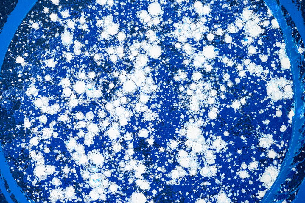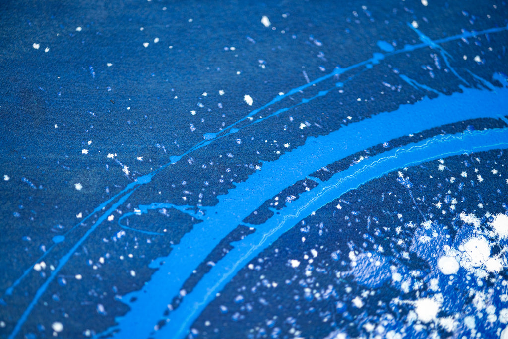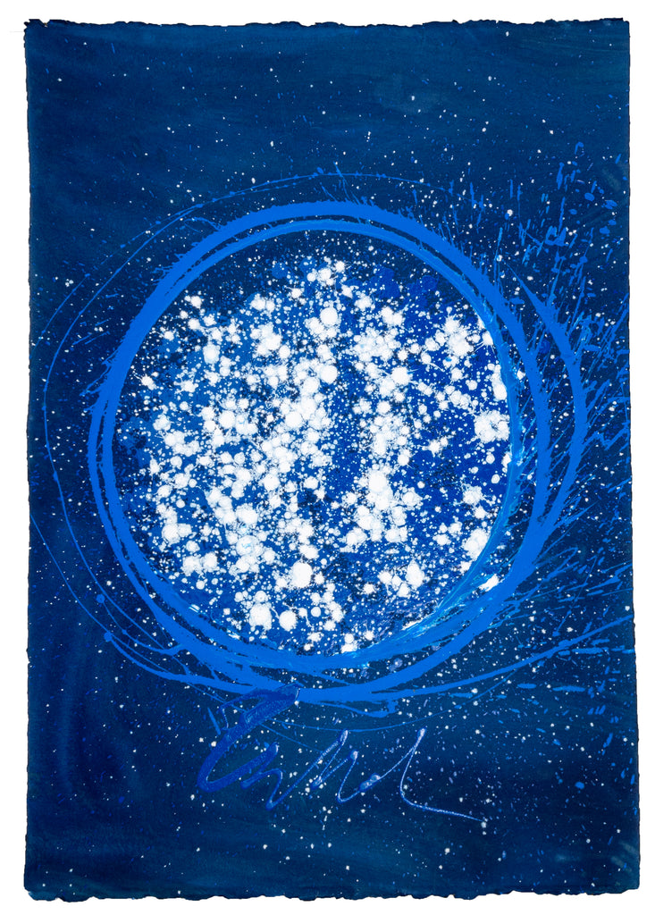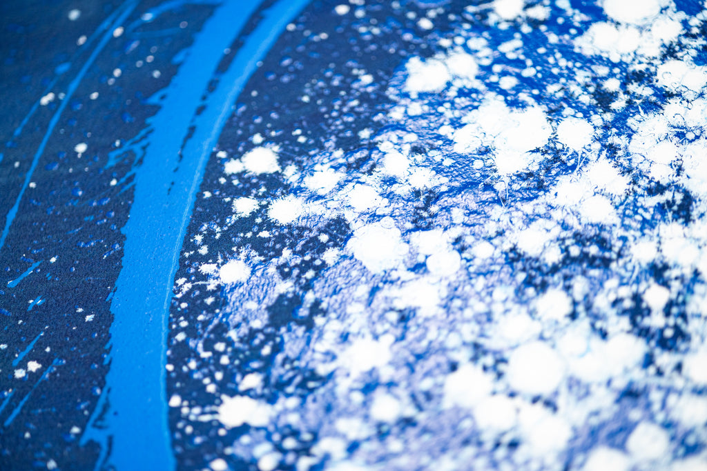 This work features a vivid cerulean blue circle, referencing Chihuly's signature garden installation floats. The circle is punctuated with silver dots and set against a rich midnight blue background. The contrast of the luminous foreground against the deep, dark ground creates a sense of depth and visual movement, evoking the interplay of light and reflection that defines the artist's glass works.