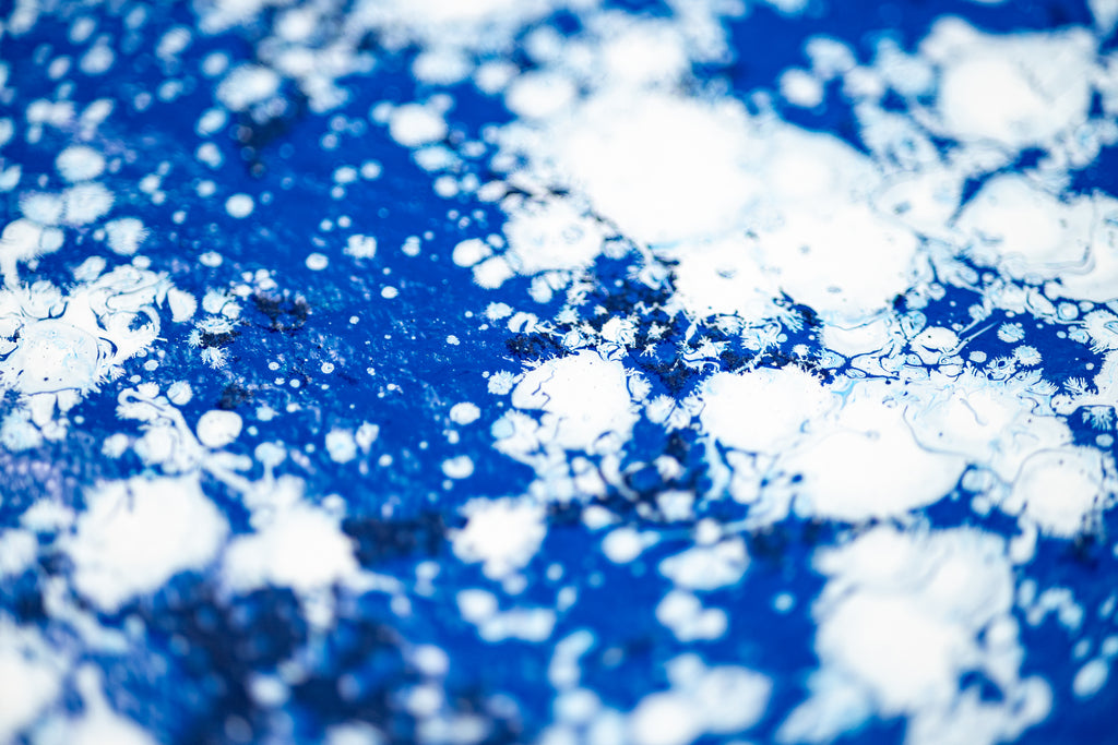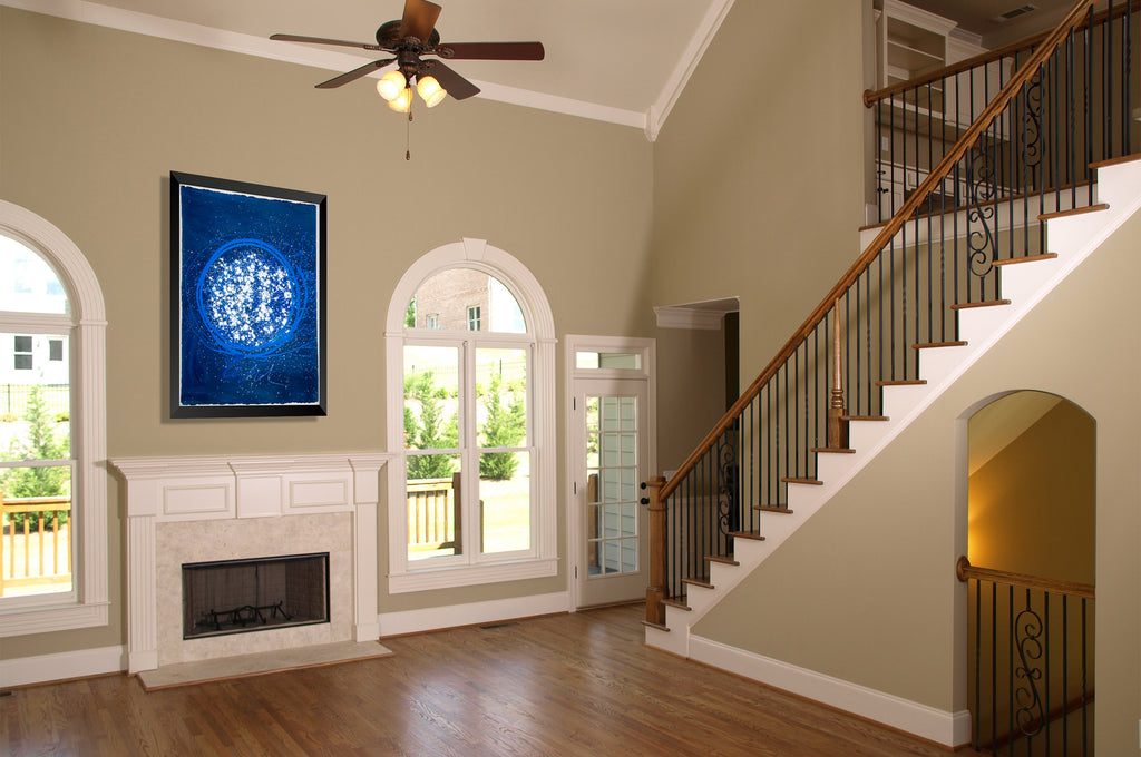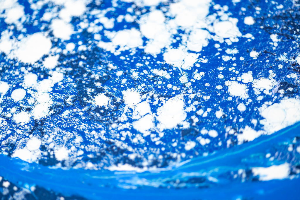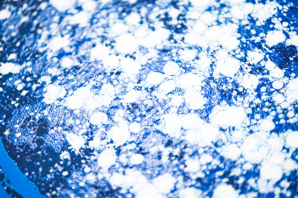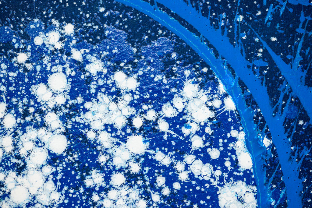 This work features a vivid cerulean blue circle, referencing Chihuly's signature garden installation floats. The circle is punctuated with silver dots and set against a rich midnight blue background. The contrast of the luminous foreground against the deep, dark ground creates a sense of depth and visual movement, evoking the interplay of light and reflection that defines the artist's glass works.