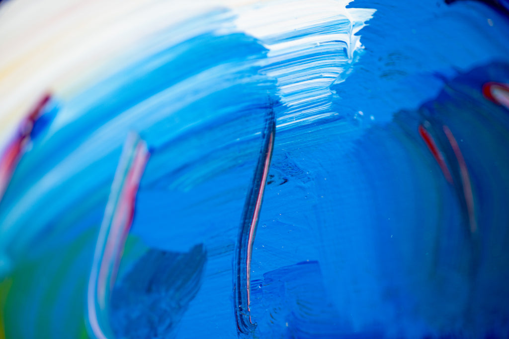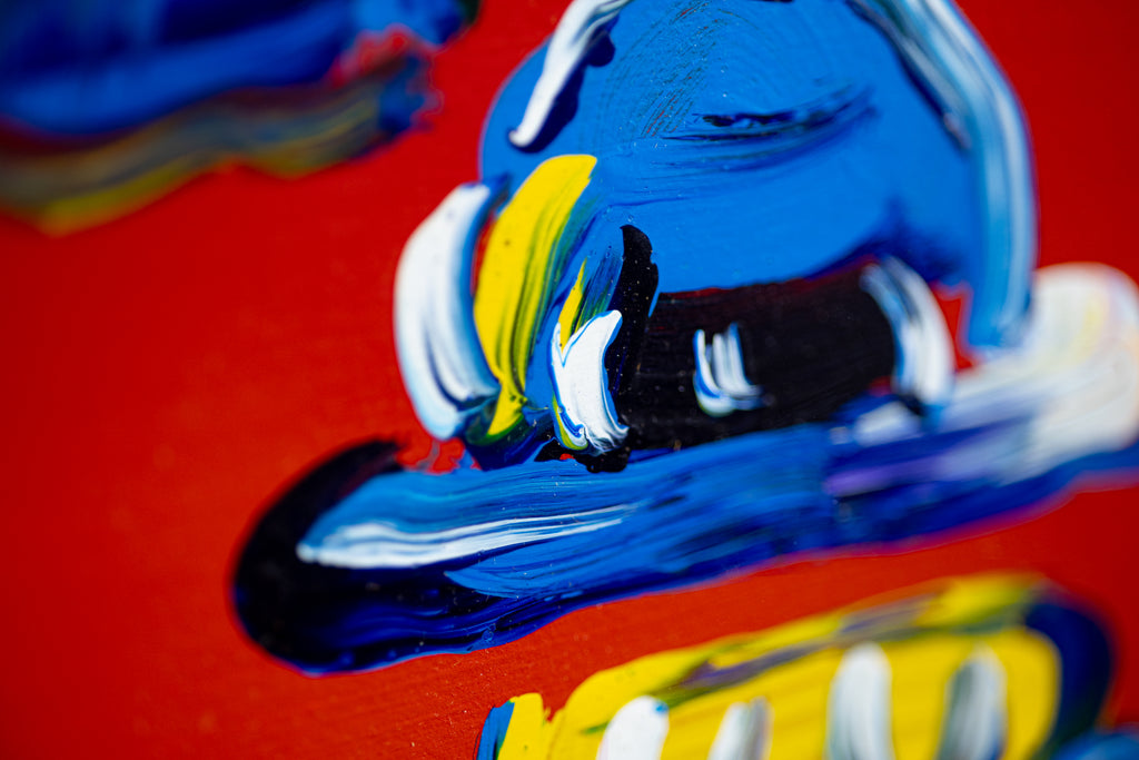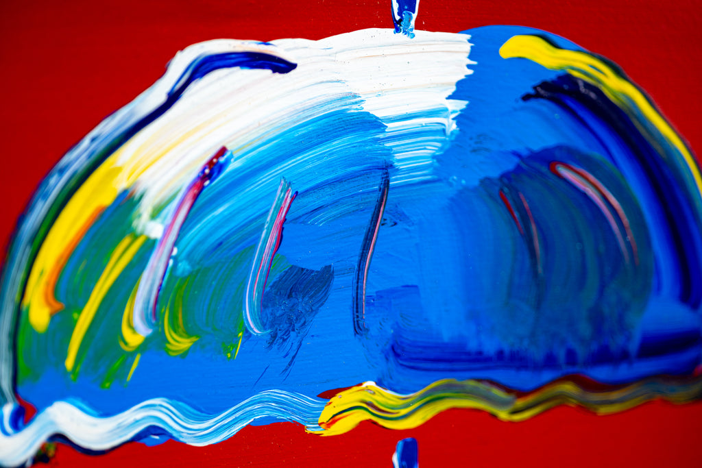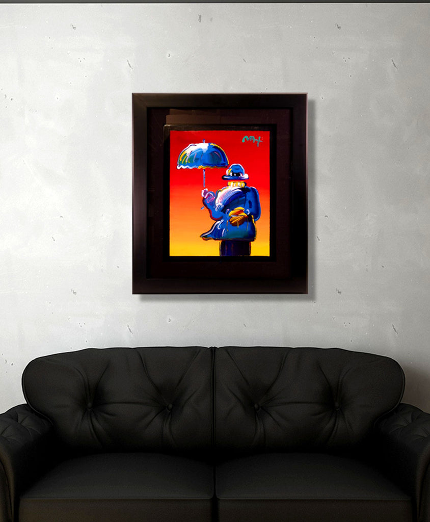 Peter Max's "Umbrella Man on Red" (v. III #38), represents one of the artist's most enduring motifs, the silhouetted figure carrying an umbrella. First introduced in the late 1970s, the Umbrella Man became a recurring emblem within Max's oeuvre, symbolizing both anonymity and universality in the modern urban experience. In this 2015 original acrylic painting, the figure is rendered in deep blue, a striking counterpoint to the luminous background of red, yellow, and orange that evokes a glowing sunset.