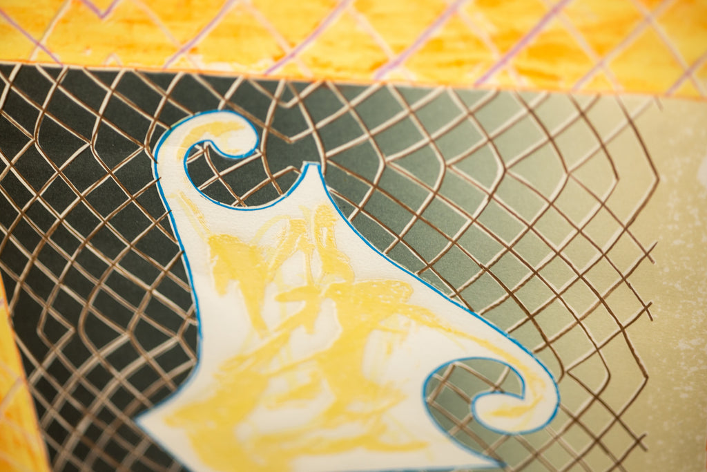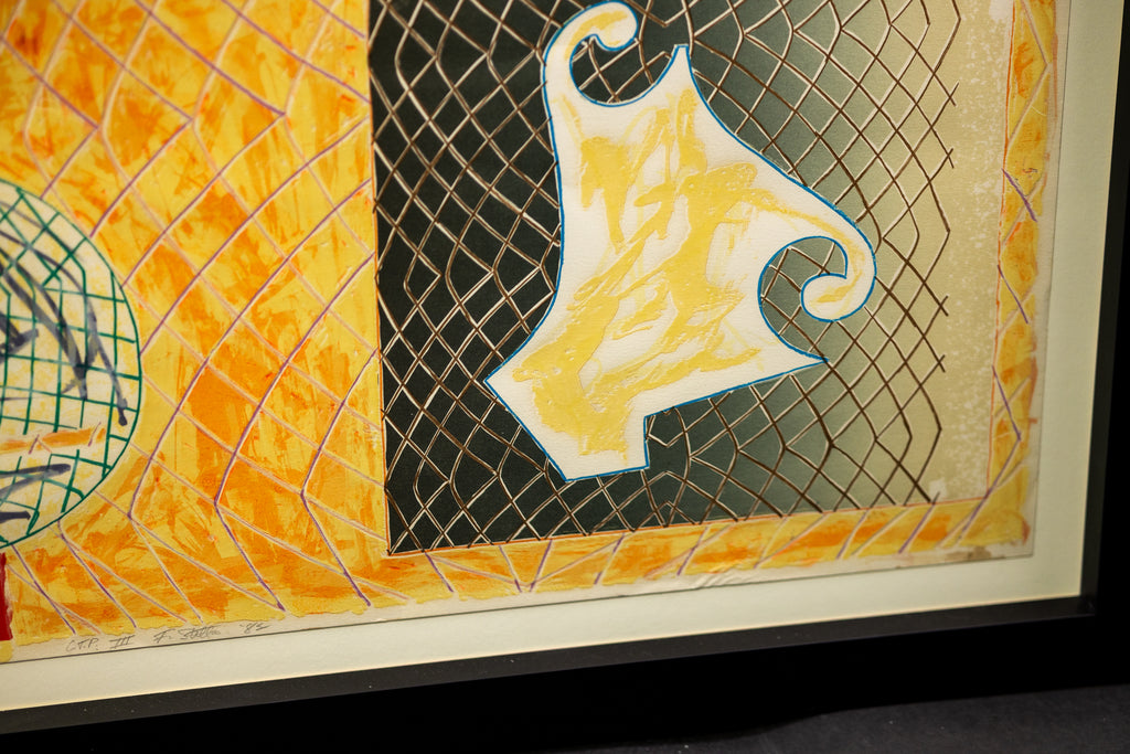 Frank Stella's "Shards IV", from the 1982 "Shards" series, exemplifies the artist's ongoing exploration of texture, form, and abstraction during the early 1980s. Created through a combination of offset lithography and screen-printing, this work demonstrates Stella's characteristic precision and engagement with geometric complexity while simultaneously referencing previous series in his oeuvre. The "Shards" series derives its name from Stella's practice of repurposing elements from earlier works, notably the "Circuits Series" and the 1980 "Polar Coordinates for Ronnie Peterson" series, to construct layered compositions that evoke depth and movement.