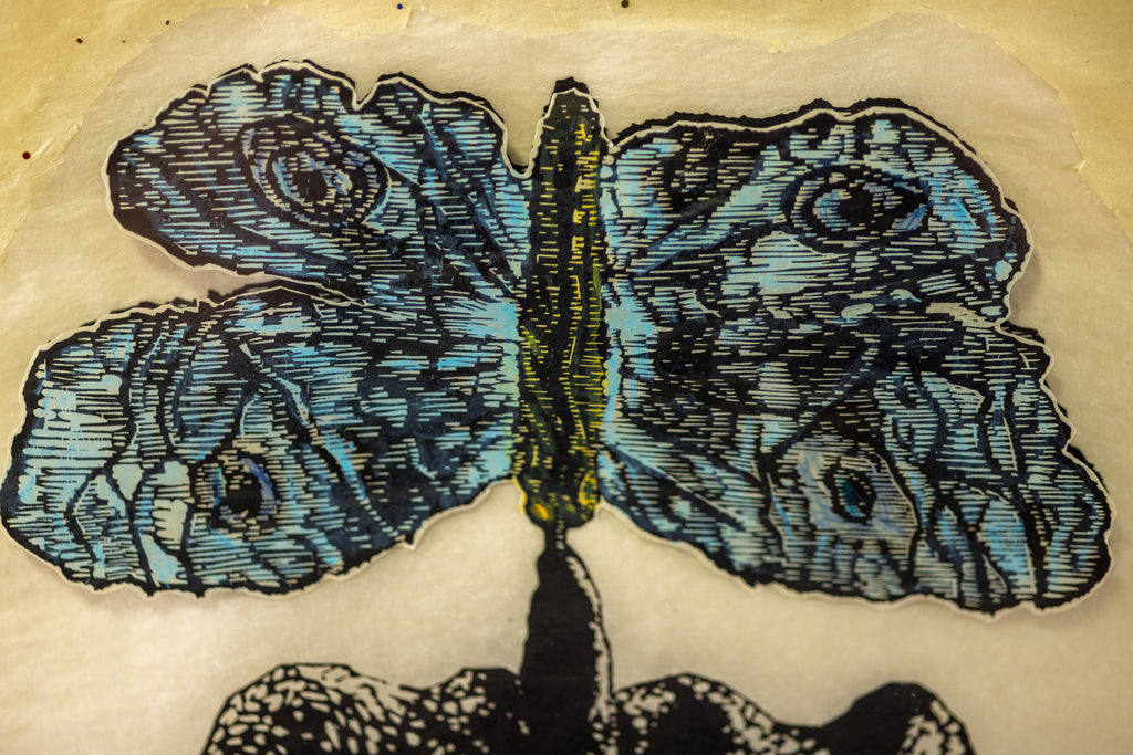 Medium: Woodcut with Hand-Coloring, Glitter, and Layered Collage on Nepalese Paper