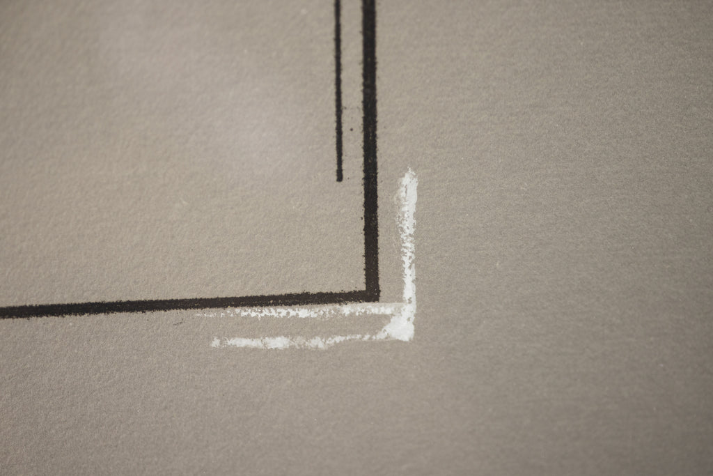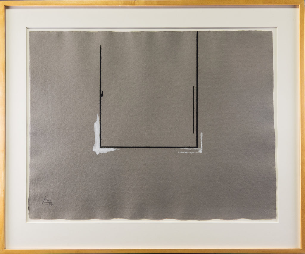 Visually, the composition evokes what might be called "an open space". A defined rectangular form or suggestive window-like void appears against the gray field, its white-painted segments creating a quiet sense of light, openness, and spatial ambiguity. This restrained geometry harkens to the ethos of Motherwell's "Open" series, where minimal lines or shapes on monochrome grounds evoke contemplative interior and exterior spaces, bridging abstraction and metaphor.