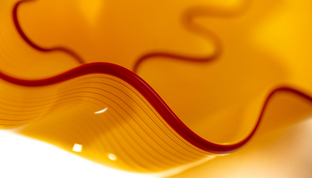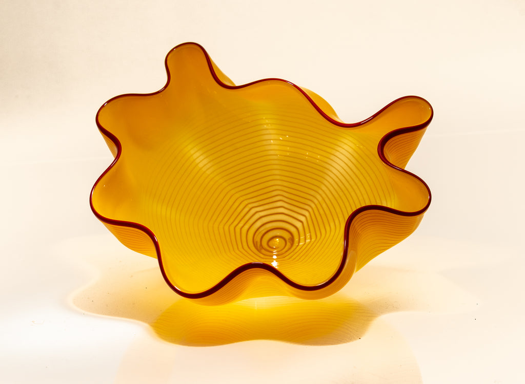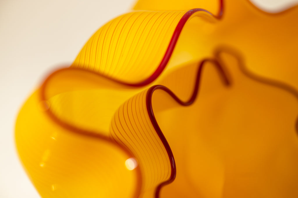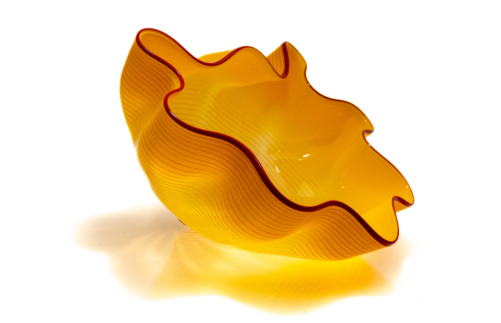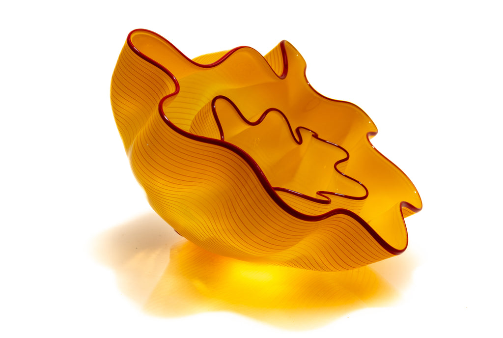 Dale Chihuly's "Saffron Seaform Pair" exemplifies the artist's modern-era exploration of color, form, and surface detail. This pair demonstrates Chihuly's characteristic use of vibrant, saturated colors and the contrasting lip wrap, which adds visual tension and sculptural complexity to the forms. The bright saffron hues and dynamic shapes exemplify Chihuly's interest in organic, biomorphic structures, recalling natural elements such as sea life and botanical forms while retaining an abstract sensibility. The juxtaposition of the two elements emphasizes scale, proportion, and spatial dialogue, reflecting the artist's ongoing engagement with compositional experimentation.