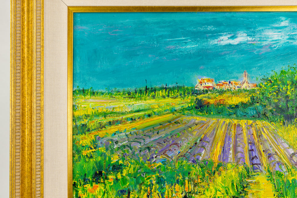 Yolande Ardissone's "European Vineyard" is an oil on canvas painting that presents a measured and detailed depiction of a vineyard under a calm teal-blue sky. The composition features rows of carefully rendered grapevines extending toward a small European village in the distance, reflecting Ardissone's precise integration of natural and architectural elements. Through the application of saturated color and nuanced brushwork, the artist conveys a sense of light, depth, and spatial coherence across the pastoral scene, emphasizing both the structure of the landscape and the subtle interplay of shadows and textures.