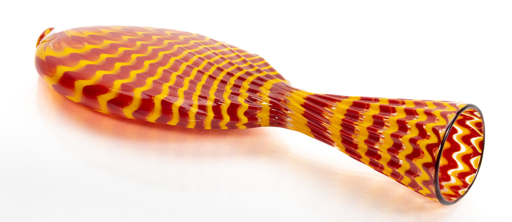 Dale Chihuly's "Cinnabar and Coral Persian Set with Black Lip Wraps" (1998) is a commanding example from the artist's celebrated Persian series, known for its bold forms, radiant colors, and complex, multi-element compositions. Measuring over 21 inches at its widest point, this set demonstrates Chihuly's ability to transform hand-blown glass into an expansive, sculptural environment.