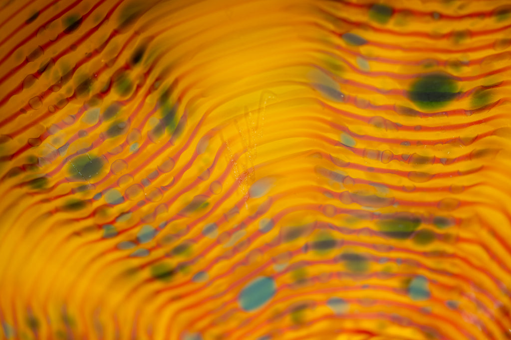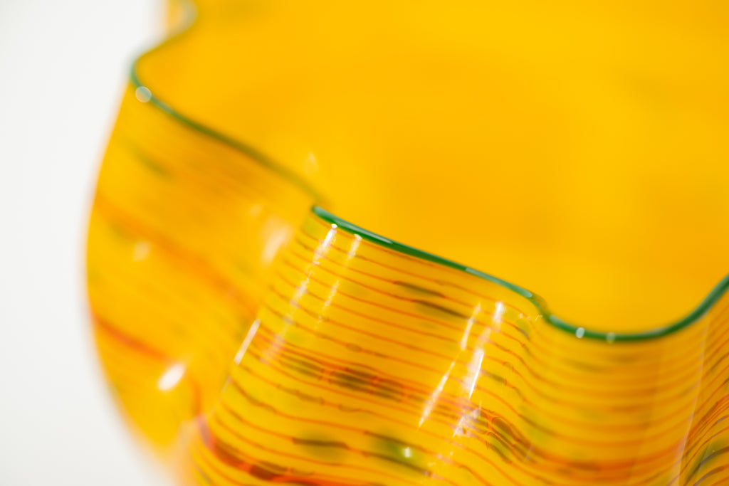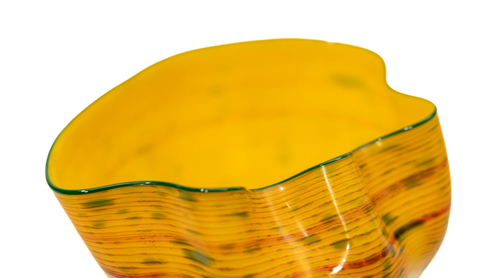 Dale Chihuly's "Desert Yellow Macchia" belongs to one of the artist's most celebrated and technically complex series, the Macchia. Initiated in the early 1980s, the Macchia series allowed Chihuly to explore the expressive potential of color, form, and light within handblown glass. The term macchia, meaning “spot" in Italian, refers to the flecked and variegated coloration that characterizes these works. Each piece is distinguished by its vibrant palette, unpredictable surface patterning, and softly undulating contours that suggest organic growth and movement.