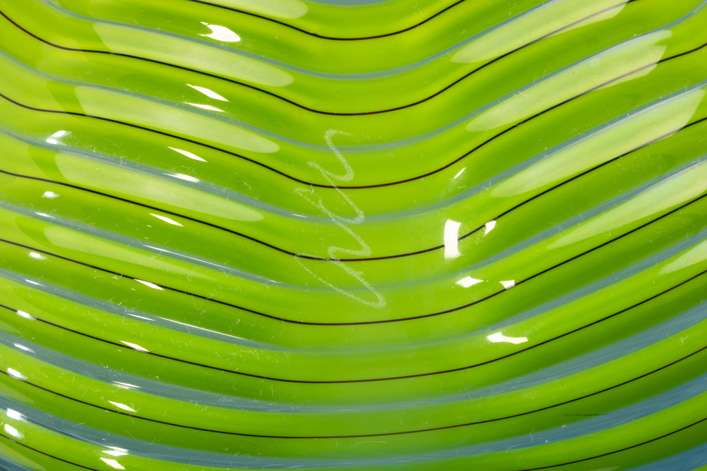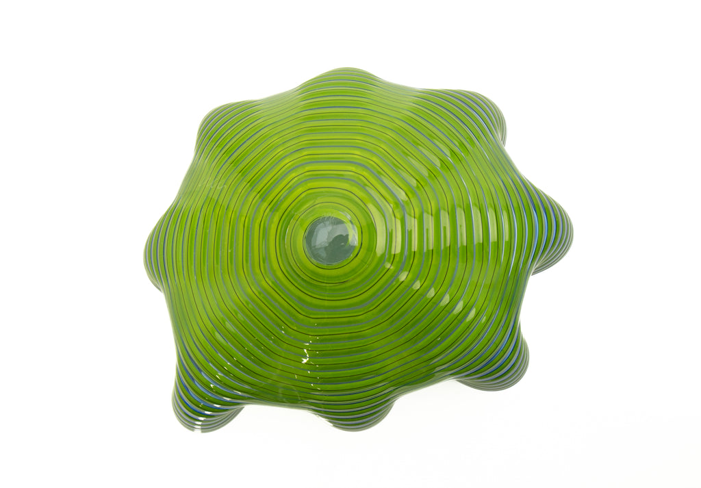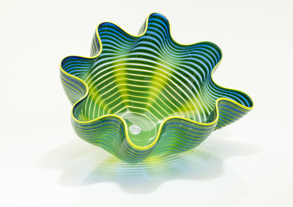 The sculpture's body features delicate wraps of shadowed blue interlaced with bright yellow-green accents, emphasizing its layered form and highlighting the elegance of its sculptural silhouette. These dynamic color contrasts, combined with the smooth, flowing surface, capture light in a way that enhances both the visual and tactile qualities of the work. The edges of the piece are accented with lip wraps, further defining its contours and drawing attention to the intricate craftsmanship and deliberate attention to form that are hallmarks of Chihuly's practice.