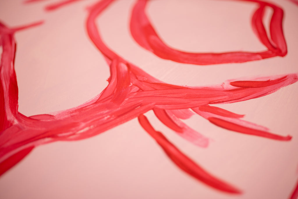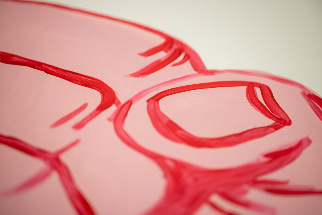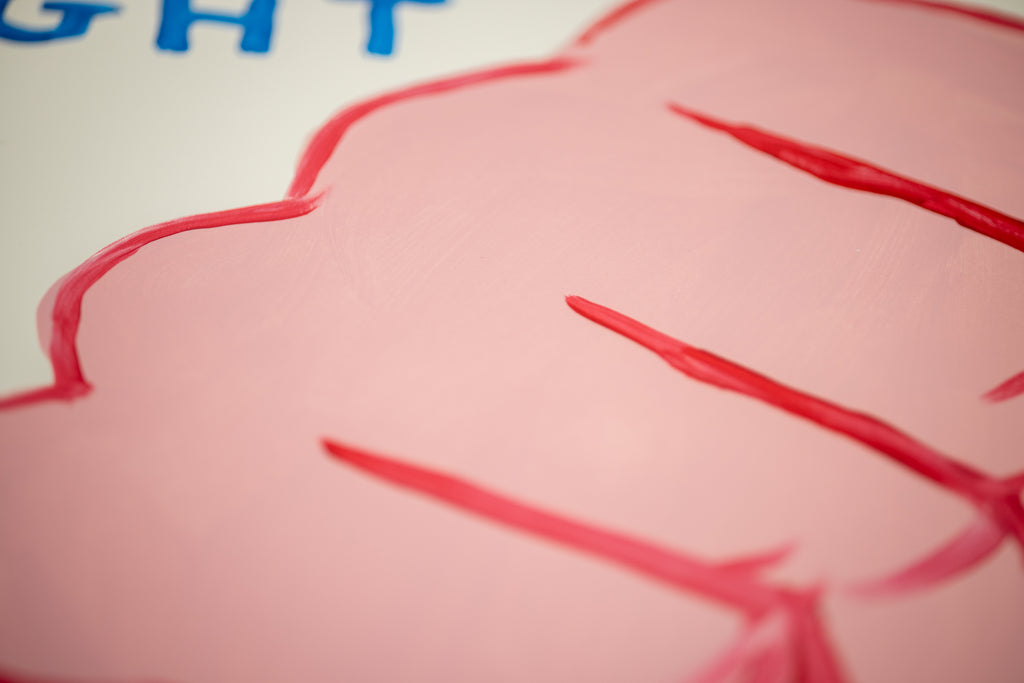 David Shrigley's "Fight Your Paranoia" (2022), presents a direct and emblematic image that encapsulates the artist's characteristic balance of humor, urgency, and psychological insight. Executed in acrylic on Fabriano paper, the composition centers on a raised clenched fist rendered in broad, confident strokes of pink and red against a light ground, framed by a bold blue border. Sparse handwritten text, placed near the top and lower edge of the sheet, completes the phrase that gives the work its title, functioning simultaneously as instruction, encouragement, and ironic commentary.