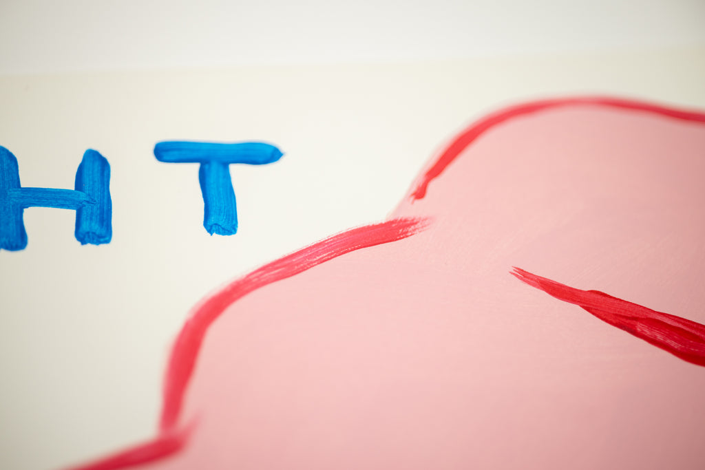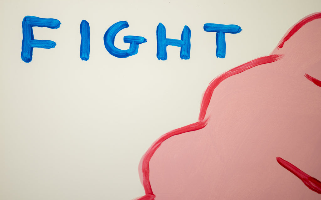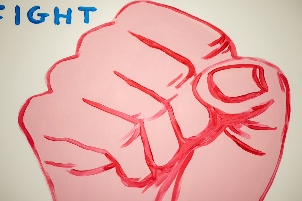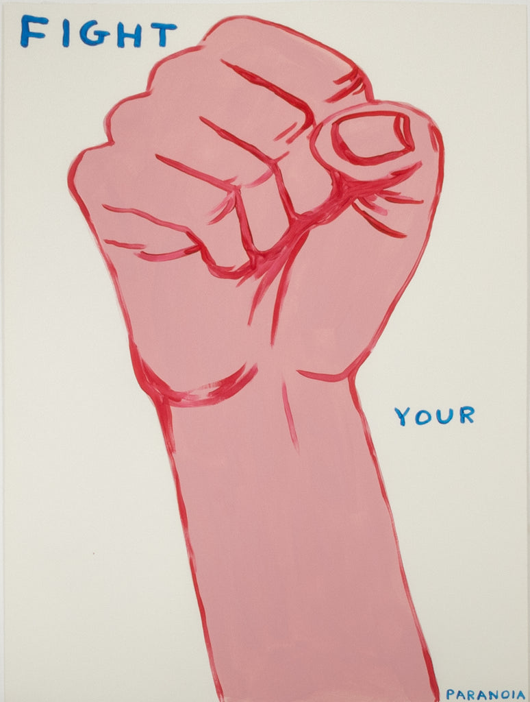 Shrigley's deliberately unrefined line and flat application of color resist traditional notions of painterly finish, instead emphasizing immediacy and conceptual clarity. The raised fist, a familiar symbol of resistance and empowerment, is presented without narrative context, allowing its meaning to remain open and contingent. Paired with the phrase 'Fight Your Paranoia', the image oscillates between sincerity and skepticism, reflecting Shrigley's ongoing interest in the contradictions of modern emotional life and the difficulty of self reassurance.