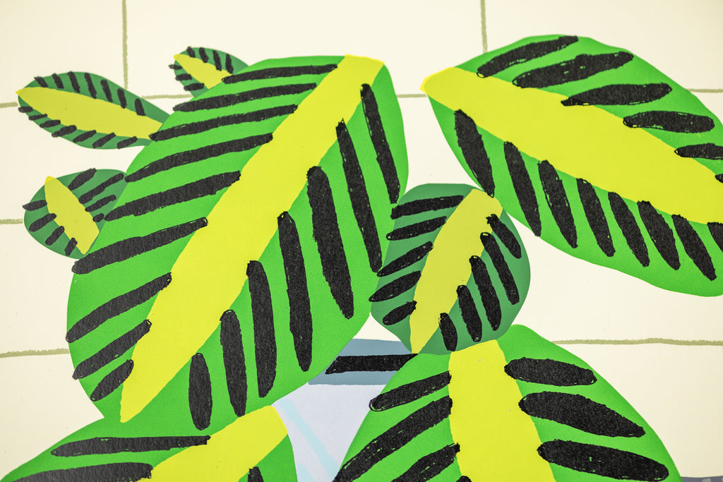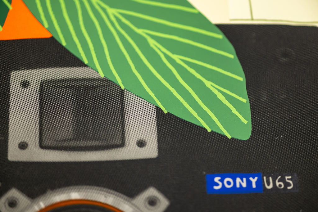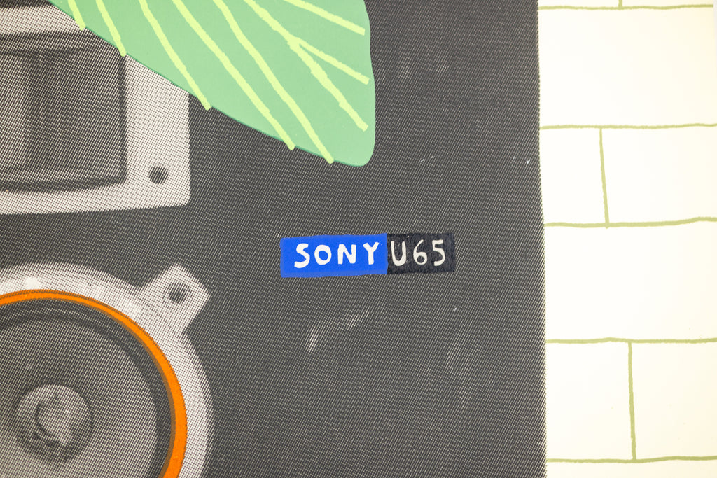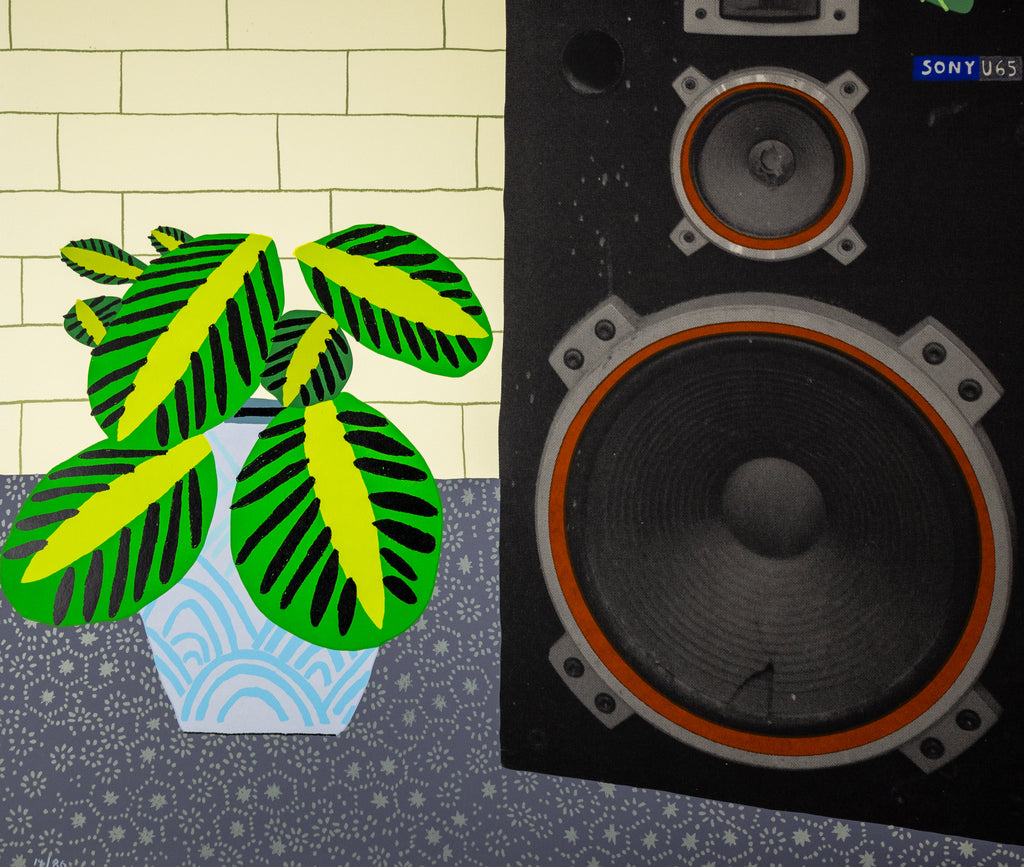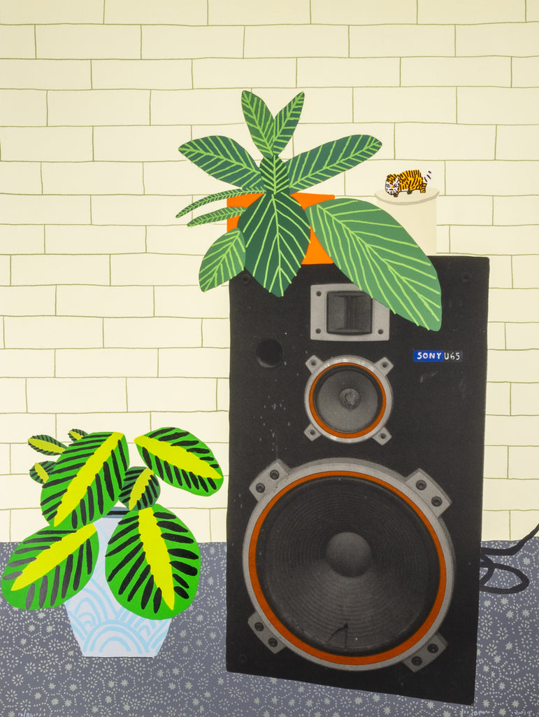 Wood's approach combines observational detail with abstraction. The speaker, a recurring motif in his work, suggests themes of sound, culture, and lived experience, while the surrounding plants introduce organic forms that counterbalance the rigid geometry of the technological object. Color plays a central role, with saturated greens, warm neutrals, and contrasting dark tones establishing visual tension and cohesion across the composition. The integration of lithographic and screenprinting techniques allows for both textural nuance and graphic clarity, reinforcing Wood's characteristic synthesis of painterly sensibility and print discipline.