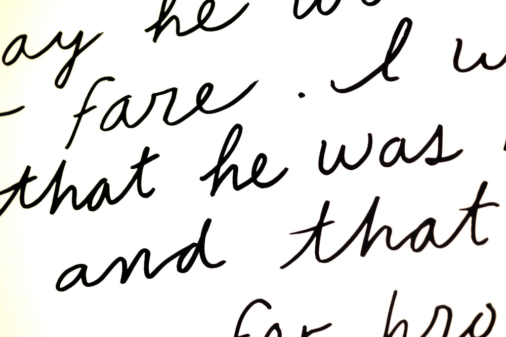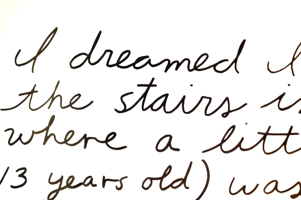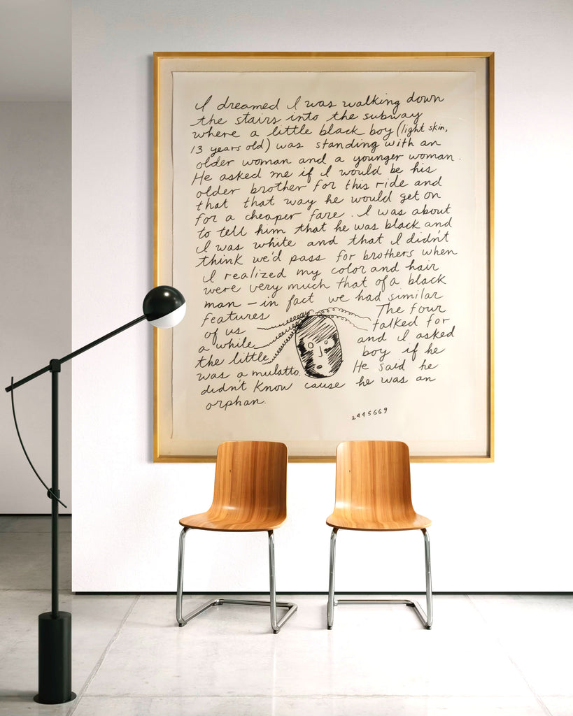 Jonathan Borofsky's "Subway Dream" (1983) exemplifies the artist's sustained exploration of text, identity, and the psychological terrain of contemporary urban life. Rendered at an imposing, near-architectural scale, the screenprint envelops the viewer with a handwritten narrative recounting a dream encounter in a subway station. The sweeping field of script—intimate in gesture yet monumental in proportion—transforms private reflection into a public, immersive experience. The viewer does not merely read the text; one stands before it, physically implicated in its confessional cadence.
