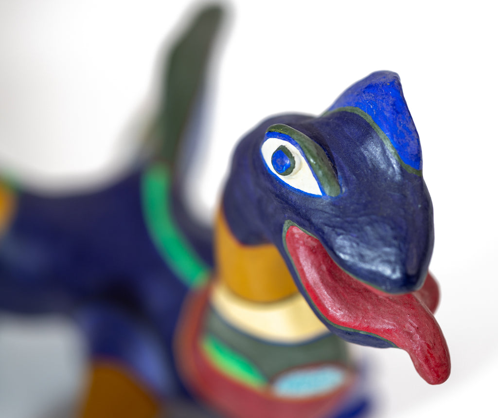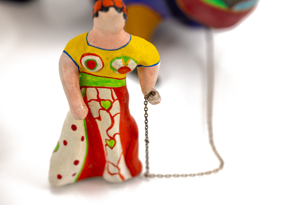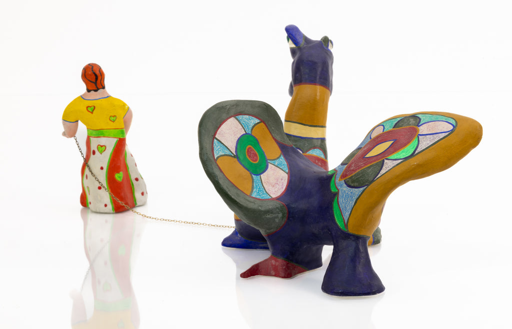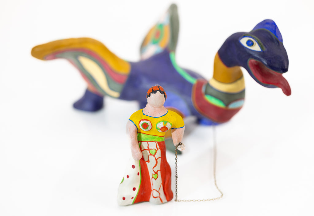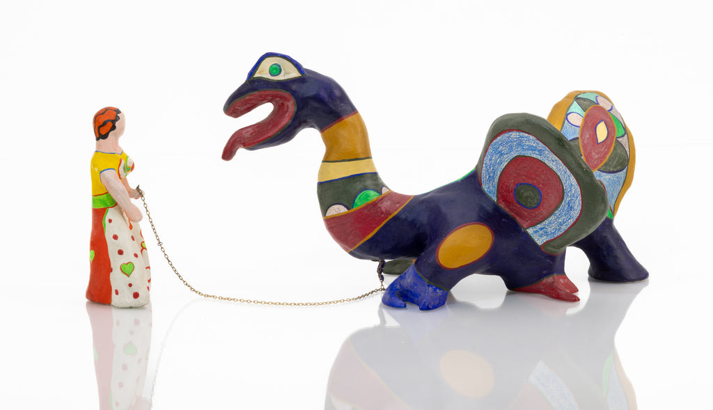 The female figure, defined by simplified anatomy and decorative surface patterning, relates formally to Saint Phalle's celebrated Nana sculptures, which reimagined representations of women through bold color, assertive presence, and graphic design. The dragon, rendered with playful exaggeration and saturated hues, introduces a narrative and symbolic dimension. The title, "La Force" ("Strength"), suggests an allegorical framework in which power may be understood as emotional, spiritual, or relational rather than purely physical. The chain linking the two figures establishes a visual and conceptual tension that invites open interpretation.