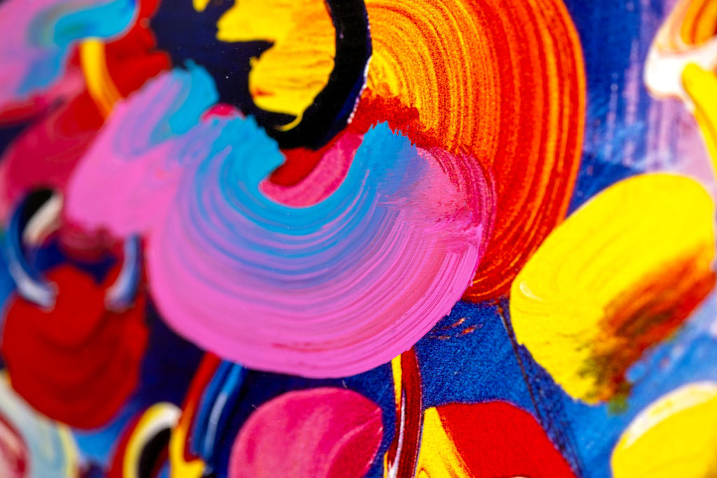 The work exemplifies Max's long-standing practice of combining printmaking with hand-applied paint. Executed as an original painting over a lithographic base, "Blushing Beauty" reveals the artist's interest in revisiting and transforming printed imagery through painterly intervention. Areas of opaque pigment and energetic brushwork animate the surface, emphasizing individuality and spontaneity while reinforcing Max's belief in art as a vehicle for optimism and visual intensity. The female figure, a recurring motif in his oeuvre, serves less as a specific sitter than as an archetypal presence shaped by color, line, and rhythm.
