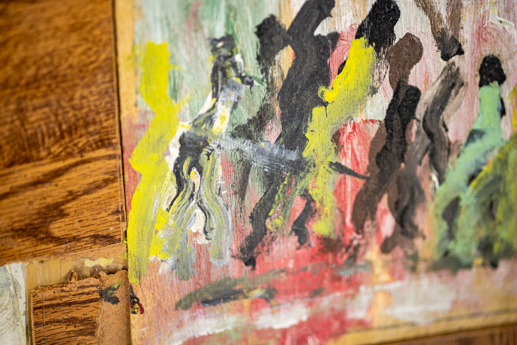 Purvis Young's pair of two untitled works mounted on masonite reflects the artist's distinctive use of found and repurposed materials, combining expressive brushwork with an improvisational approach to composition. On the left, a group of silhouetted figures is painted in loose strokes of black, green, and red against a background of pale pink, white, and green. Their rhythmic arrangement evokes procession or gathering, a recurring motif in Young's work that points to themes of community and collective experience. Above the scene, the artist's signature "Young" is inscribed in black. The right-hand panel features elongated figures painted in black with yellow-green highlights, framed by patterned brush marks in black that create a border around the central imagery. This composition, also signed on the front, underscores Young's interest in repetition, rhythm, and the symbolic weight of human presence.