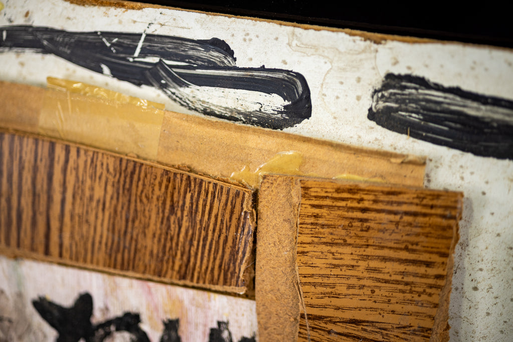 Both works are integrated within a larger painted field of white, black, and gray brushstrokes that cover the masonite support. The resulting assemblage exemplifies Young's practice of layering and juxtaposing surfaces, embracing the visible wear and irregularities of found materials as part of the work's meaning and texture.