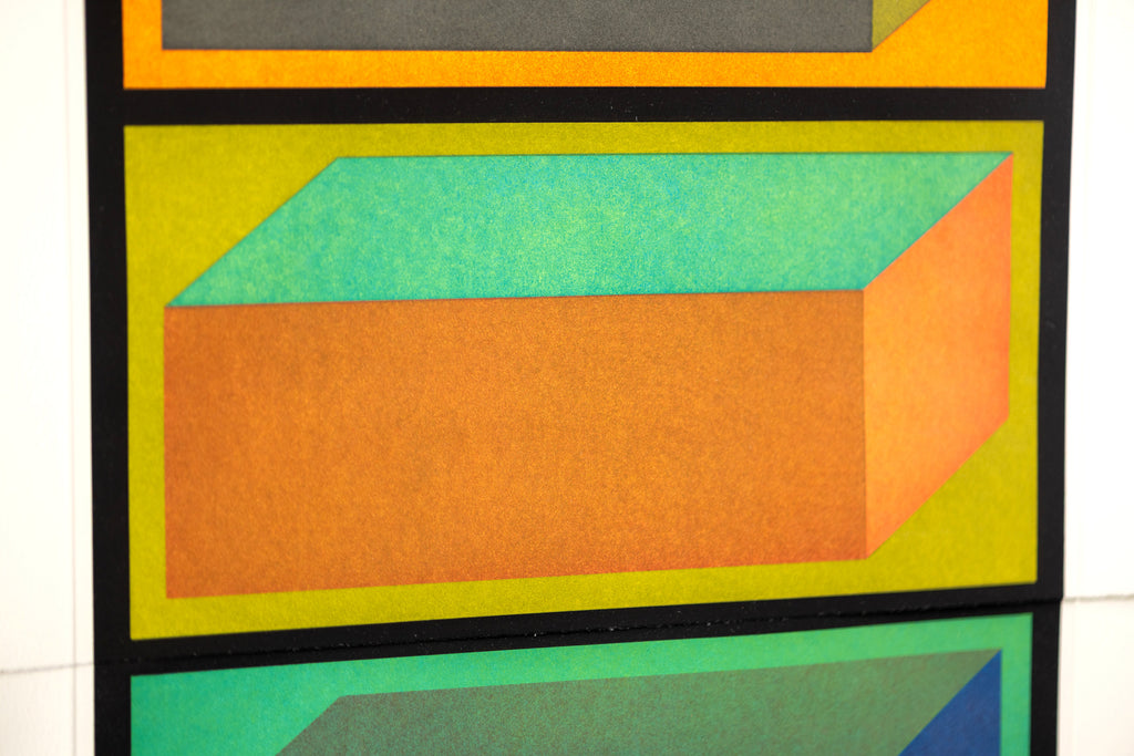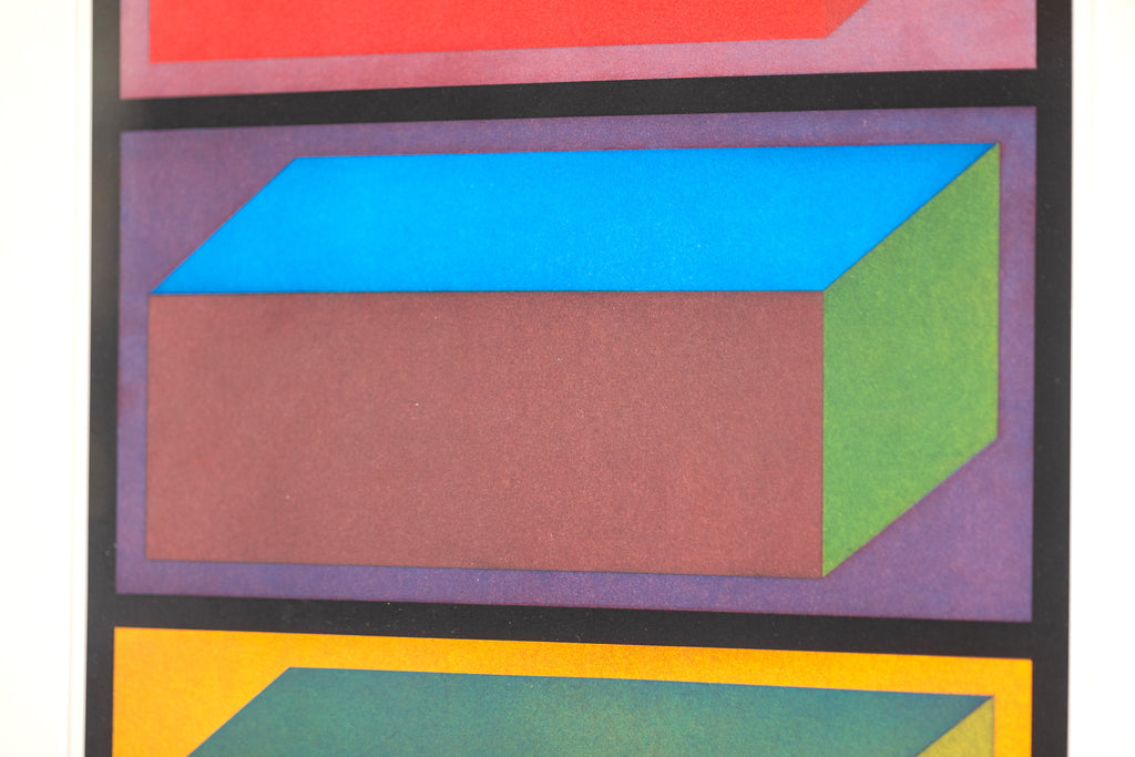 LeWitt's printmaking practice was central to his career and closely aligned with his conceptual framework. Etching and aquatint allowed for precise execution of predetermined structures while introducing subtle tonal variation through color. In "Eight Cubic Rectangles", these techniques support the work's intellectual rigor while lending visual depth and material presence to the otherwise austere geometry.